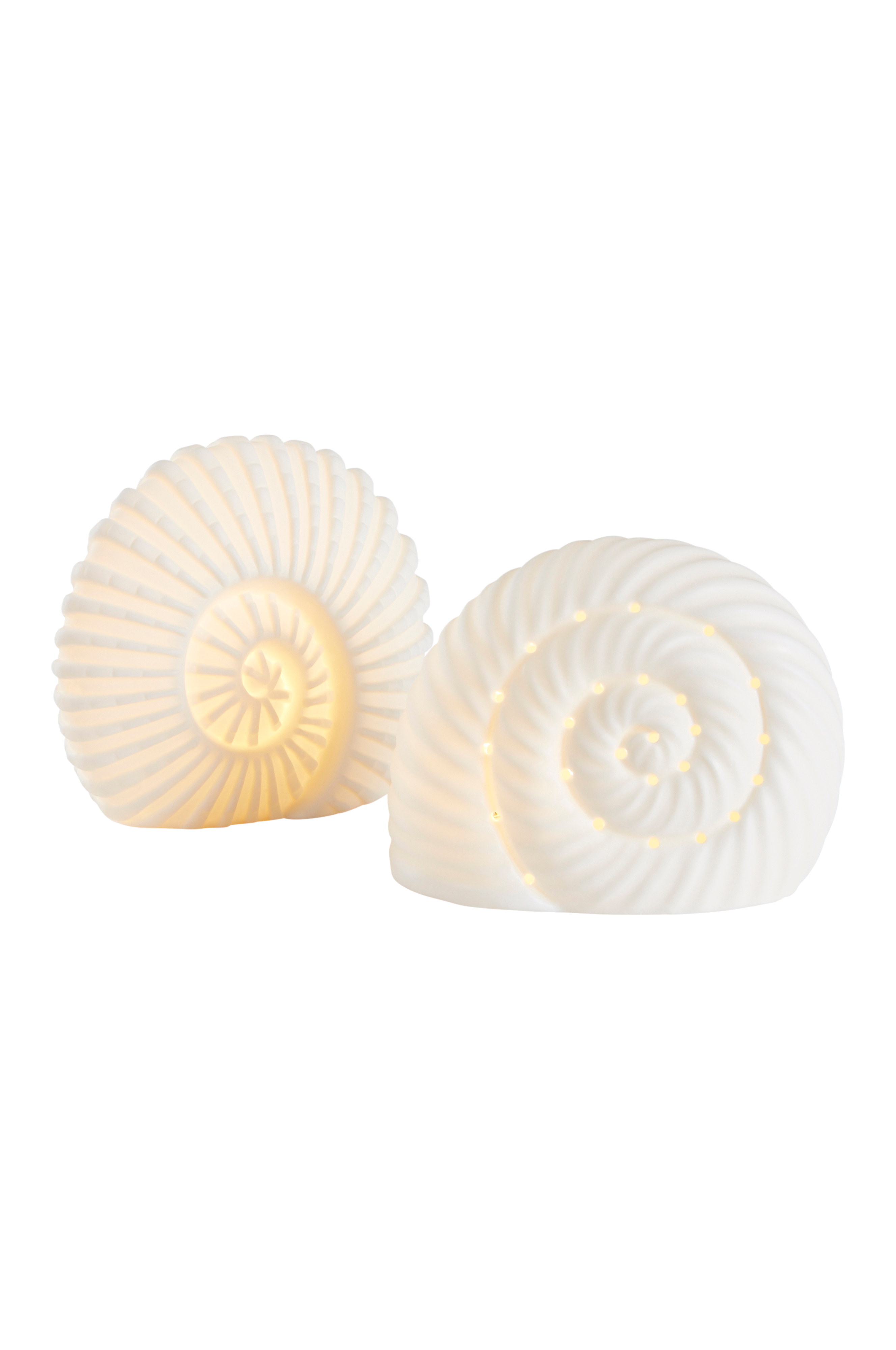 2-pk nattlamper av porselen med LED-belysning. Begge lampene er formet som skjell og er lett gjennomsiktige slik at de sprer et mykt og koselig lys. De er perfekte å ha på om natten, som mildt LED-lys eller til barn som føler seg litt tryggere med litt belysning. Batteridrevne med liten av- og påknapp under lampen.