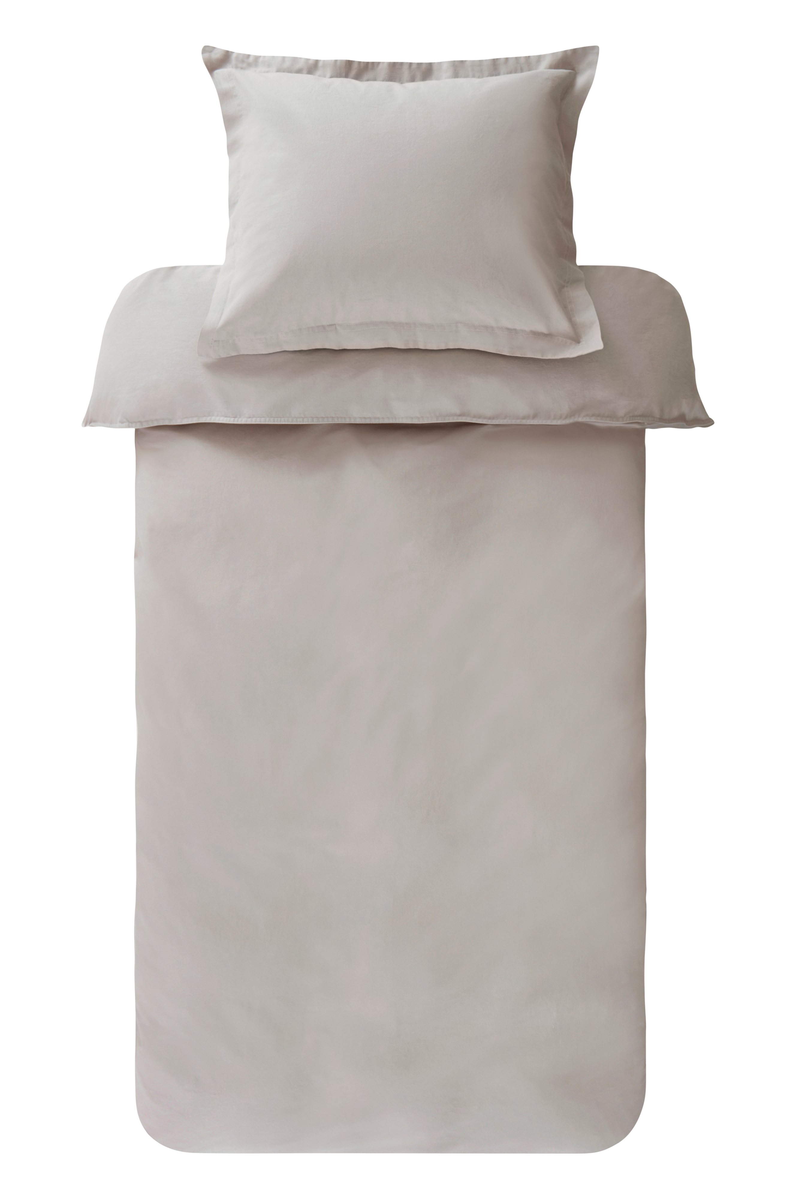 Ensfarget sengesett i 2 deler av økologisk bomull. Settet er plaggvasket. Det betyr at det er vasket etter søm slik at følelsen blir ekstra myk og deilig. Dobbeltsømmer og knapper for lukking. Putevaret har en 3 cm bred vinge rundt. Settet kommer i en fin stoffpose med trykk og snoråpning. Trådtetthet på 120 tc. (Trådtettheten forteller om antallet tråder, thread counts, pr. kvadrattomme i et stoff. Jo høyere trådtetthet, desto høyere kvalitet).