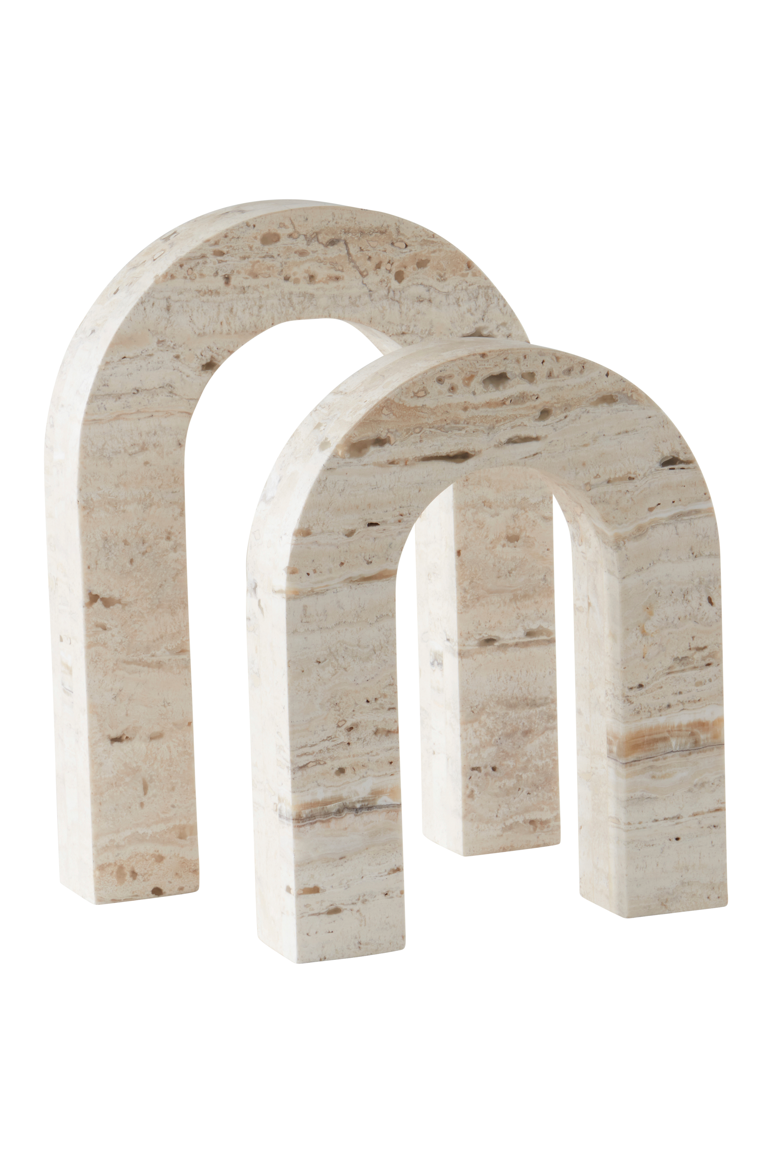 2-pk u-formede pyntegjenstander av travertin, en naturlig kalkstein med små hulrom, fargeskiftninger og fargevariasjoner. Pyntegjenstandene er nedtonet og stilrene, materialet gir tyngde. Mykt stoff på kontaktflatene beskytter underlaget. Travertin har naturlige variasjoner, noe som gjør hver pyntegjenstand unik.