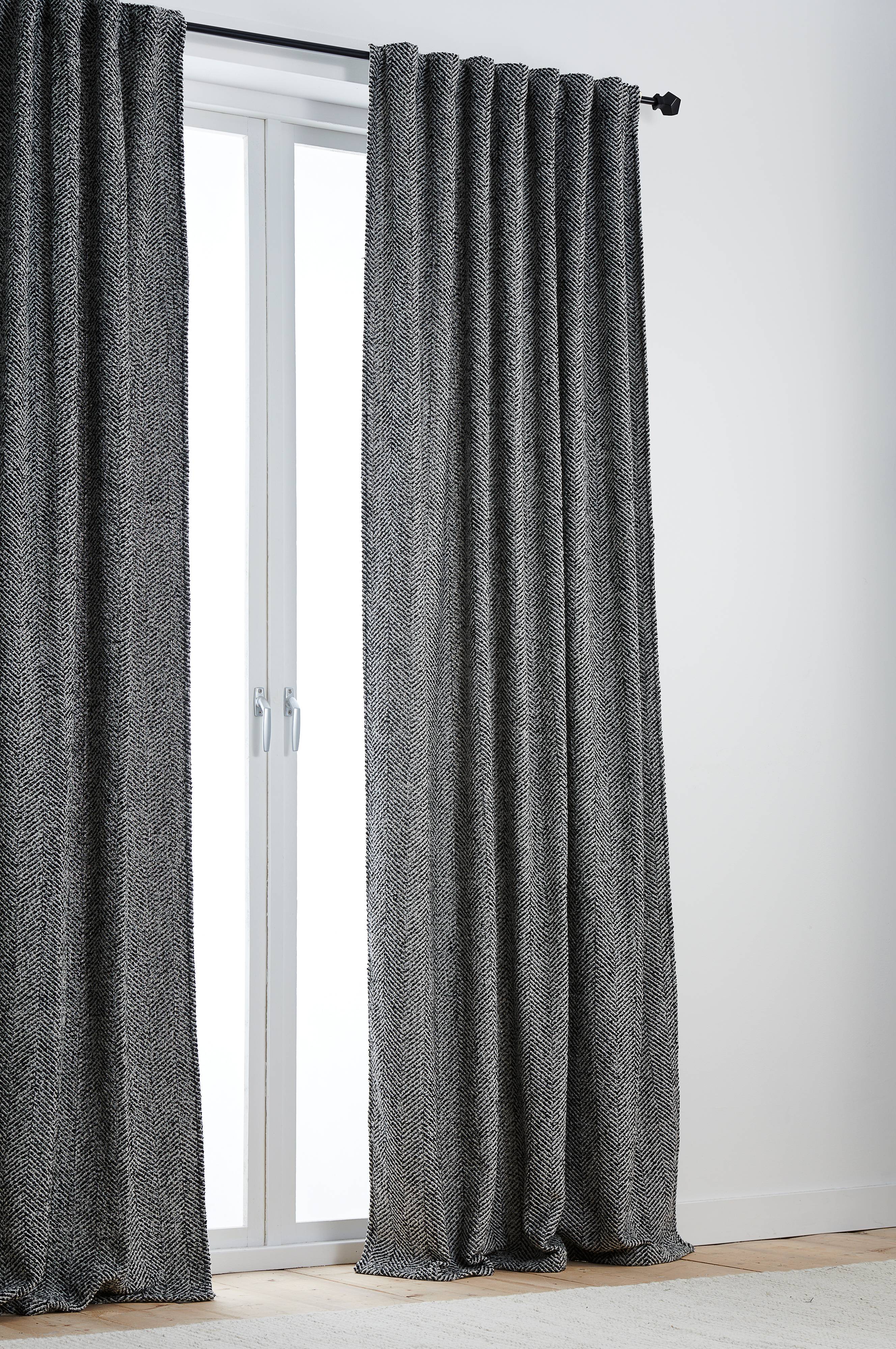 Gardinlengde av myk ullblanding med fint mønster og påsydd multifunksjonsbånd. Gardinen kan henges opp med fingerkroker, kanal samt skjult hempe.