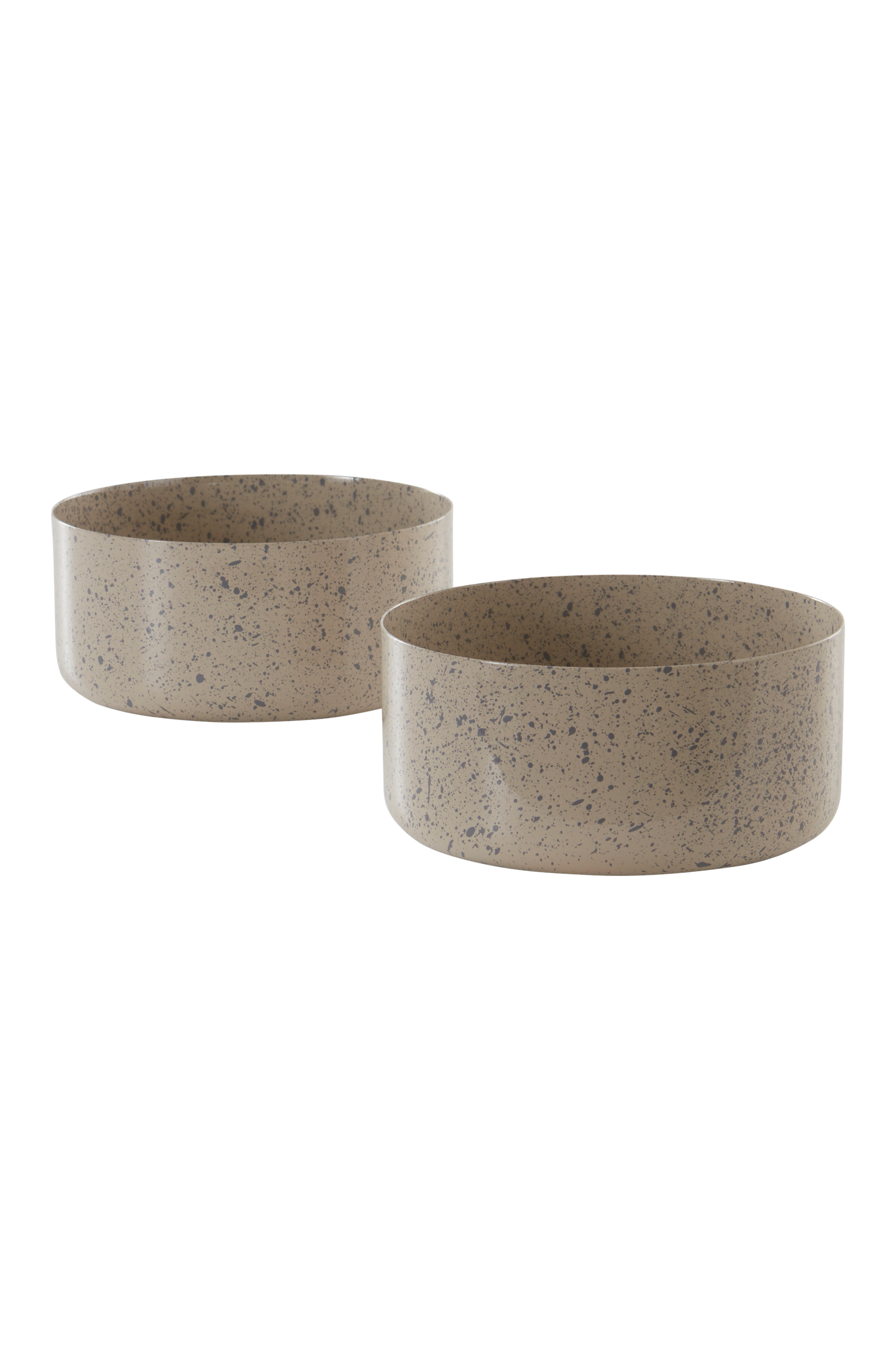 2-pk skåler av metall i tynt gods med pulverlakkert overflate. Skålene har herlig flekkmønster og fin glans. Følelsen kan sammenlignes med gammeldags emalje. Skålen har rett kant. Også innsiden er pulverlakkert og blank.