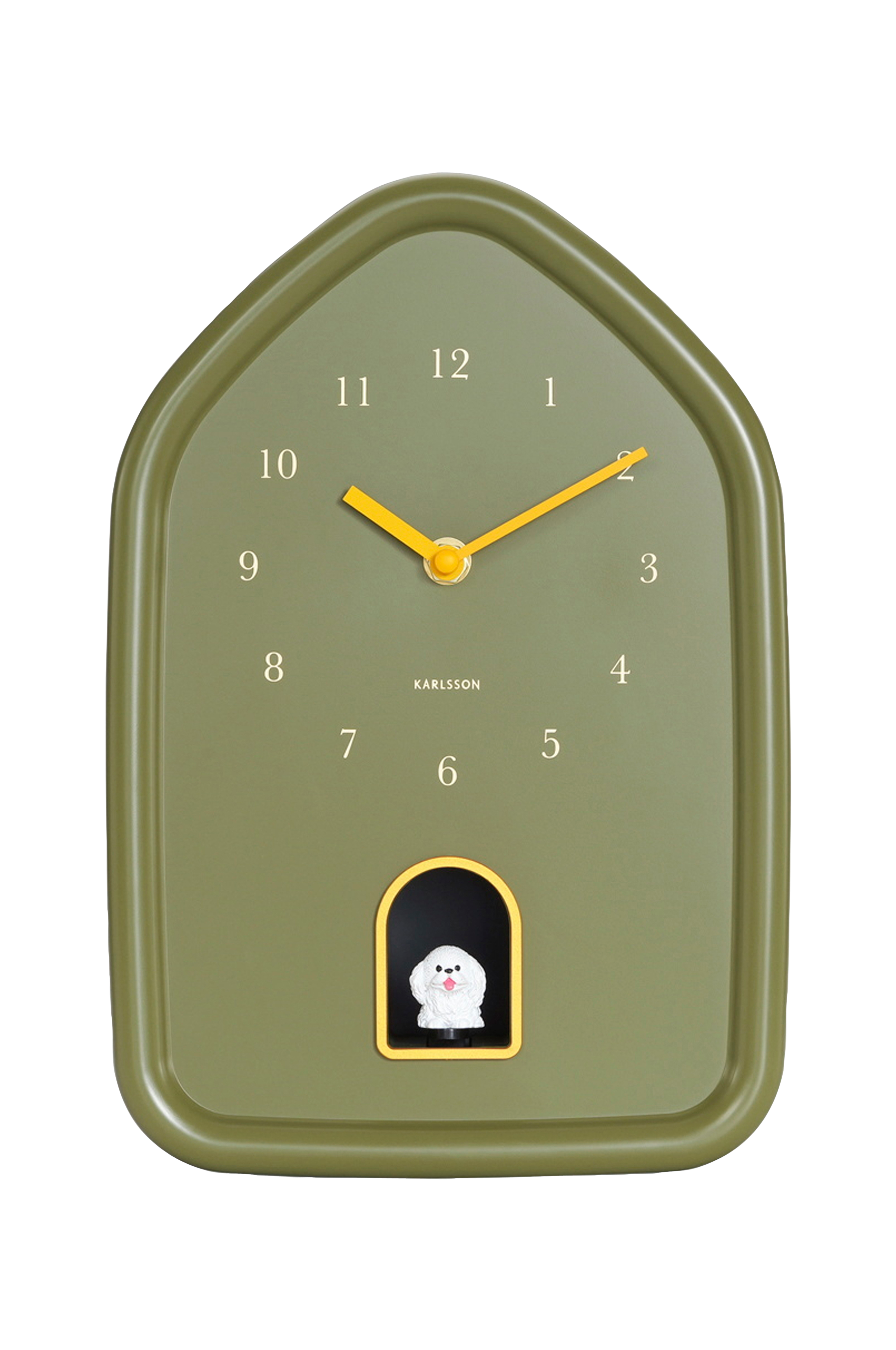 En klokke fra modern med en overraskende detalj: hver hele time gjør en liten, frekk hund seg bemerket med sin tilstedeværelse og sin lyd. Den elegante silhuetten og de subtile gullakzentene gjør dette designet til et stilig tilskudd til ethvert rom. Med sine myke kurver og varme utseende passer klokken perfekt til temaet naturlig glød. Et lekent design med karakter som bringer et smil hver gang hunden bjeffer.