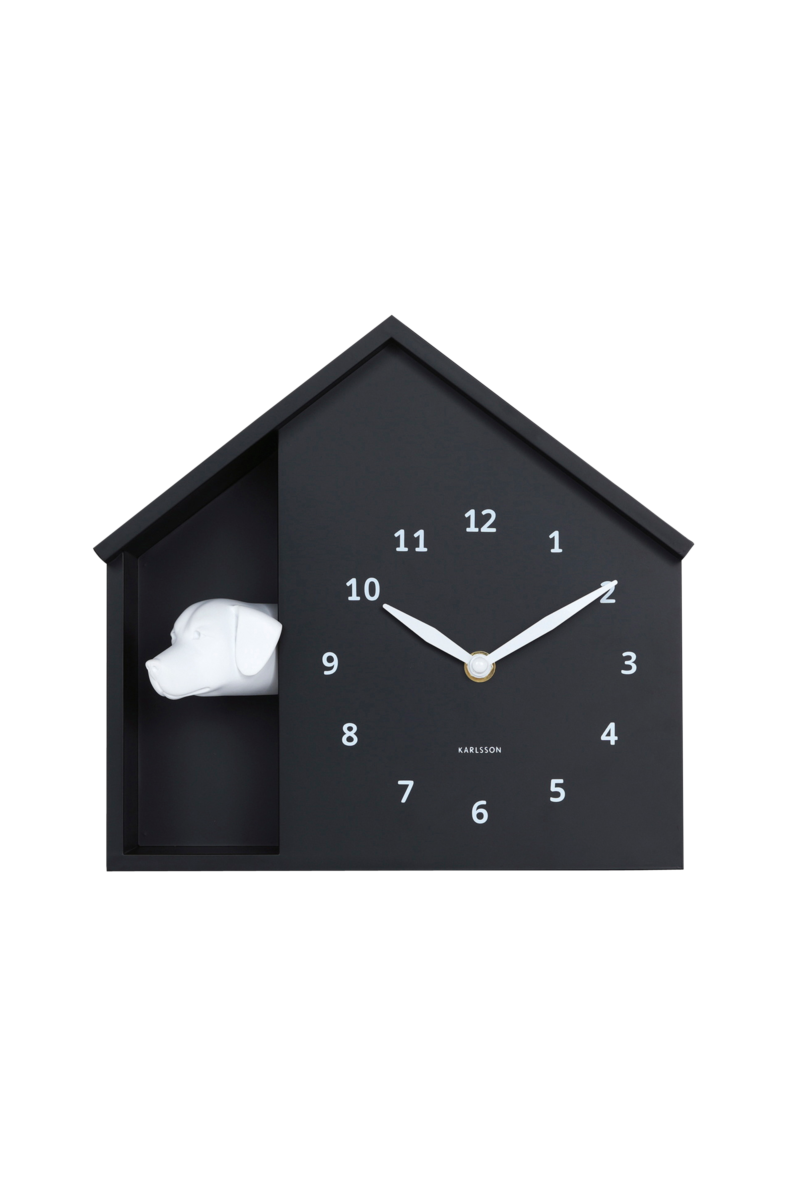 Denne lekne veggklokken er en hyllest til alle hundelskere. Inne i det sjarmerende lille huset titter en hund nysgjerrig rundt hjørnet, klar til å hjelpe deg med å planlegge dagen. Hver time bjeffer han, noe som gjør klokken ikke bare funksjonell, men også gir rommet karakter. Perfekt som et iøynefallende innslag på barnerommet, i stuen eller i gangen. Det tidløse designet og de overraskende detaljene gjør denne klokken til et unikt blikkfang.