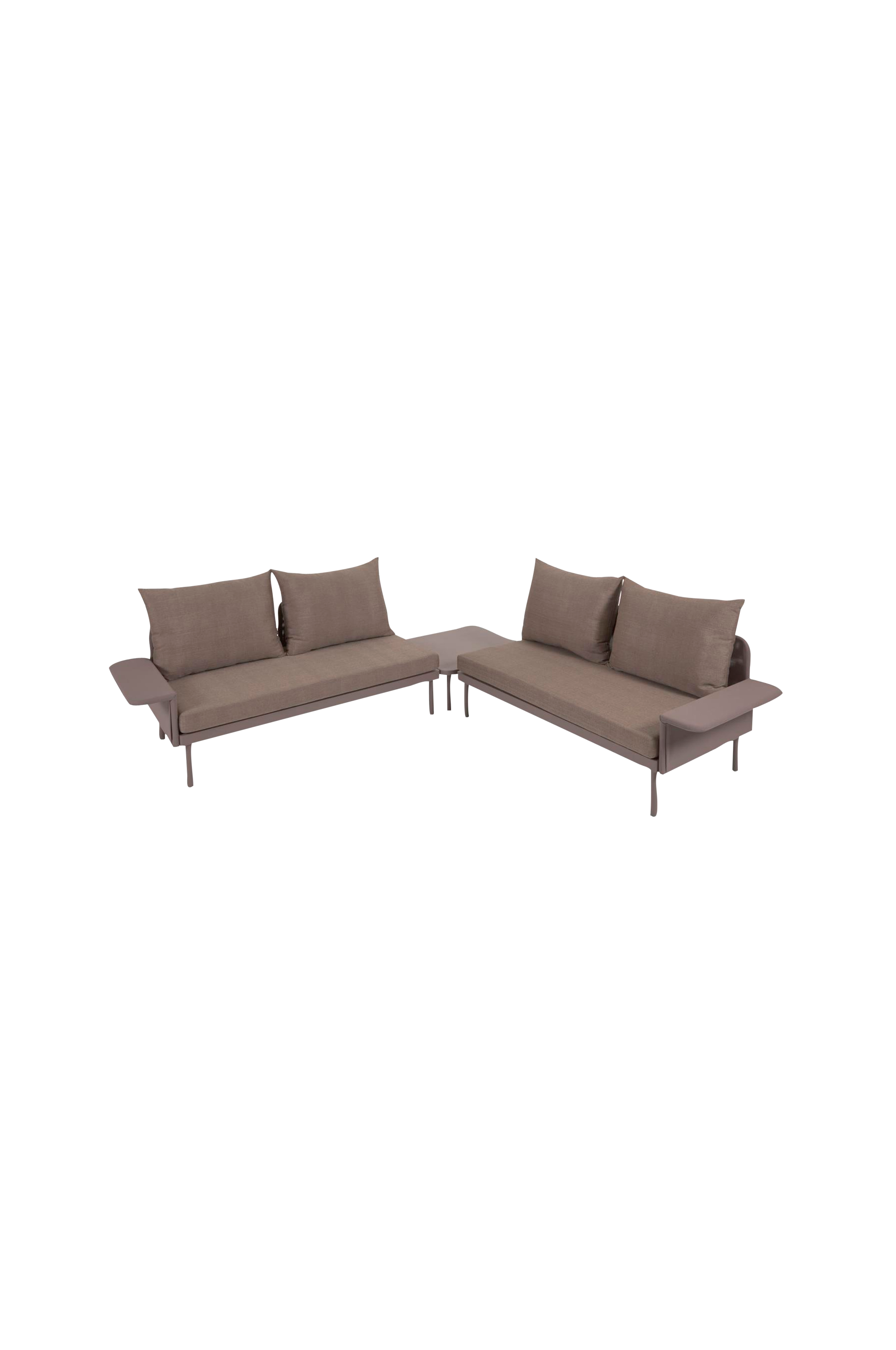 Zaltana er designet for å gi et perfekt miljø for dine favorittstunder utendørs. Og du kan nyte uten stress. Produktene er laget av 100% aluminium som er egnet for utendørs bruk, og tekstilene er vann- og UV-resistente. Gjør uteplassen klar. Mål: 230x230, høyde 82 cm. Bord: 27x70 cm.