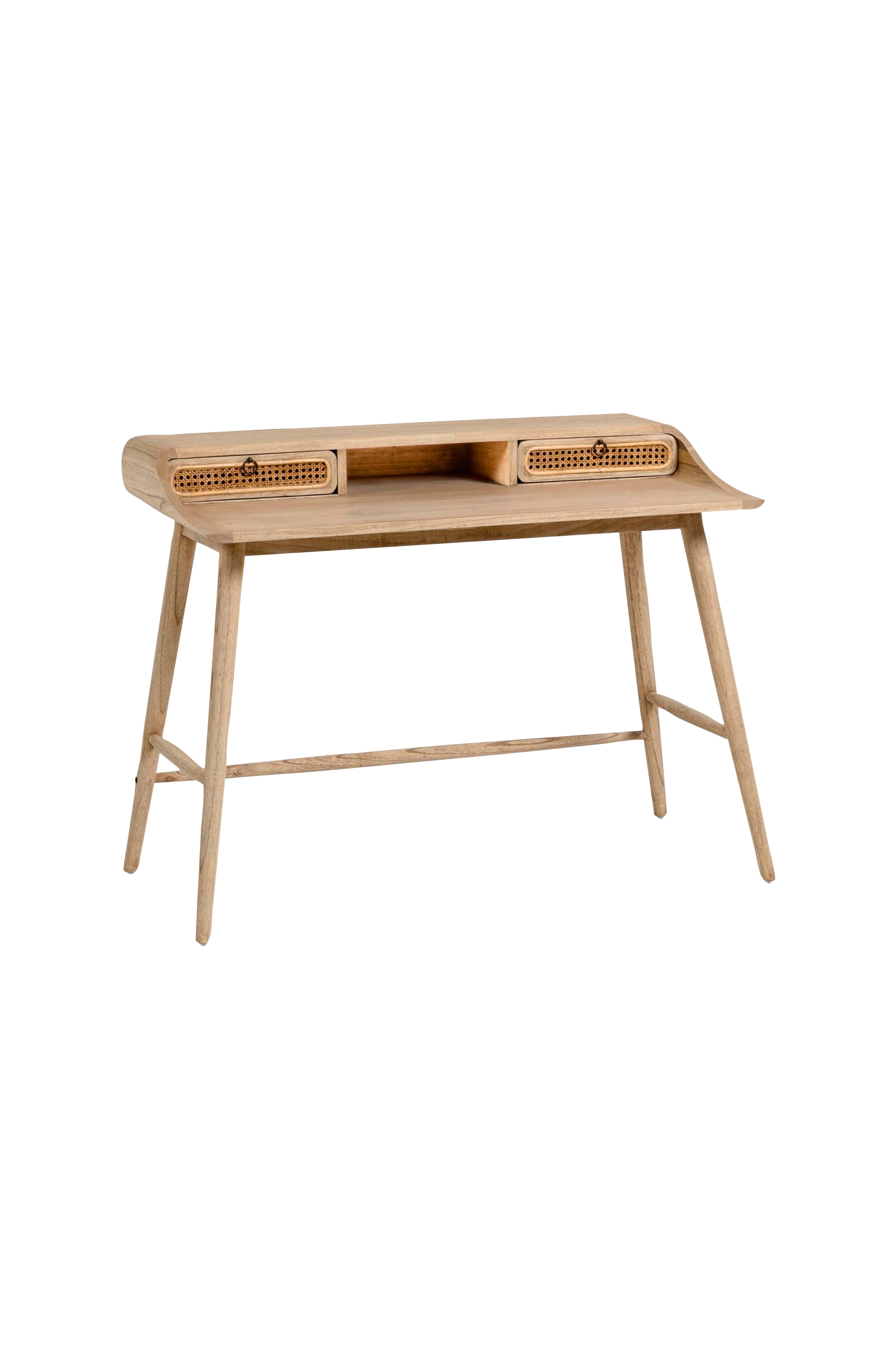 Nalu skrivebord er framstilt av massivt paternostertre med patinert utseende. For å lage stammen er treet avrundet i hjørnene. Treet er også avrundet på ulike steder for å gi toppen og skuffene en fin form. Fronten er produsert av håndvevd rotting, noe som gir en trendy stil. Et miljøvennlig designmøbel siden treet kommer fra et bærekraftig skogsbruk med ansvarlig hogst. Bredde: 110 cm. Dybde: 60 cm. Høyde: 86 cm.