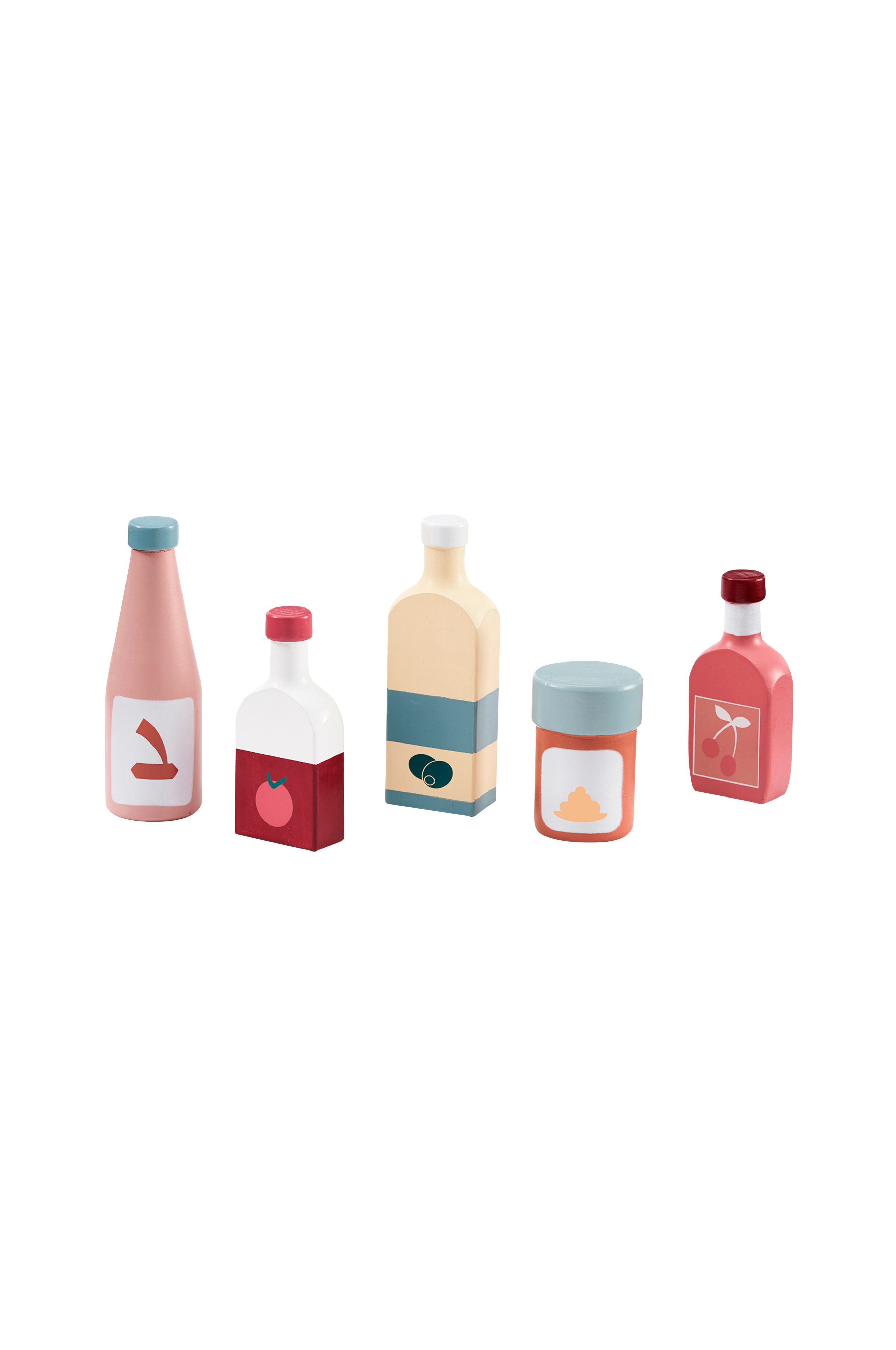 Et sett med fem ulike flasker i tre som passer perfekt til å leke butikk med eller lage lekemat med. Settet inkluderer ketchup, sennep, kirsebærsaft, soyasaus og olivenolje.