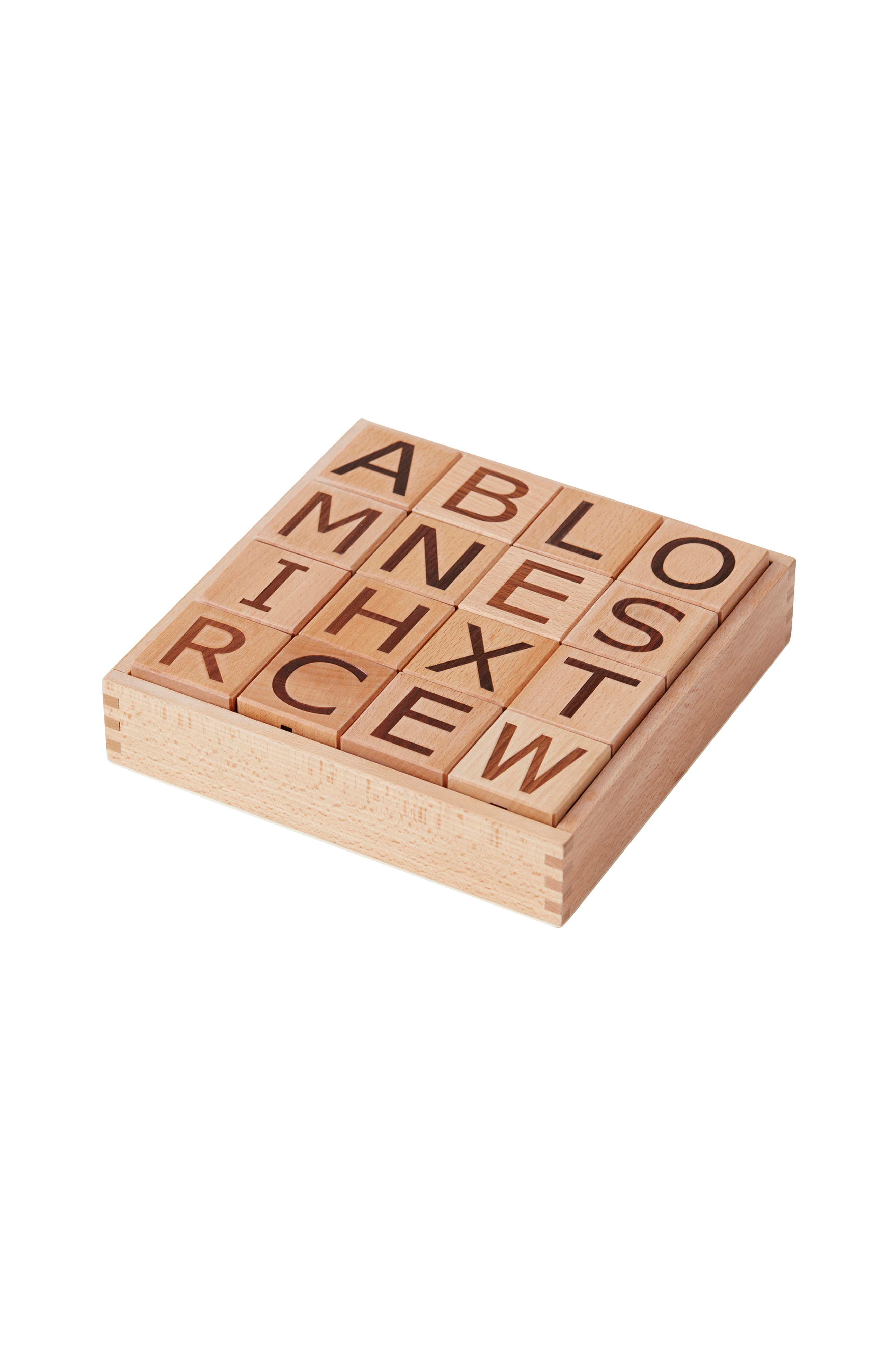 Naturfargede treklosser med bokstaver på. Spennende å leke med både for å lære seg alfabetet og for å øve motorikken med.