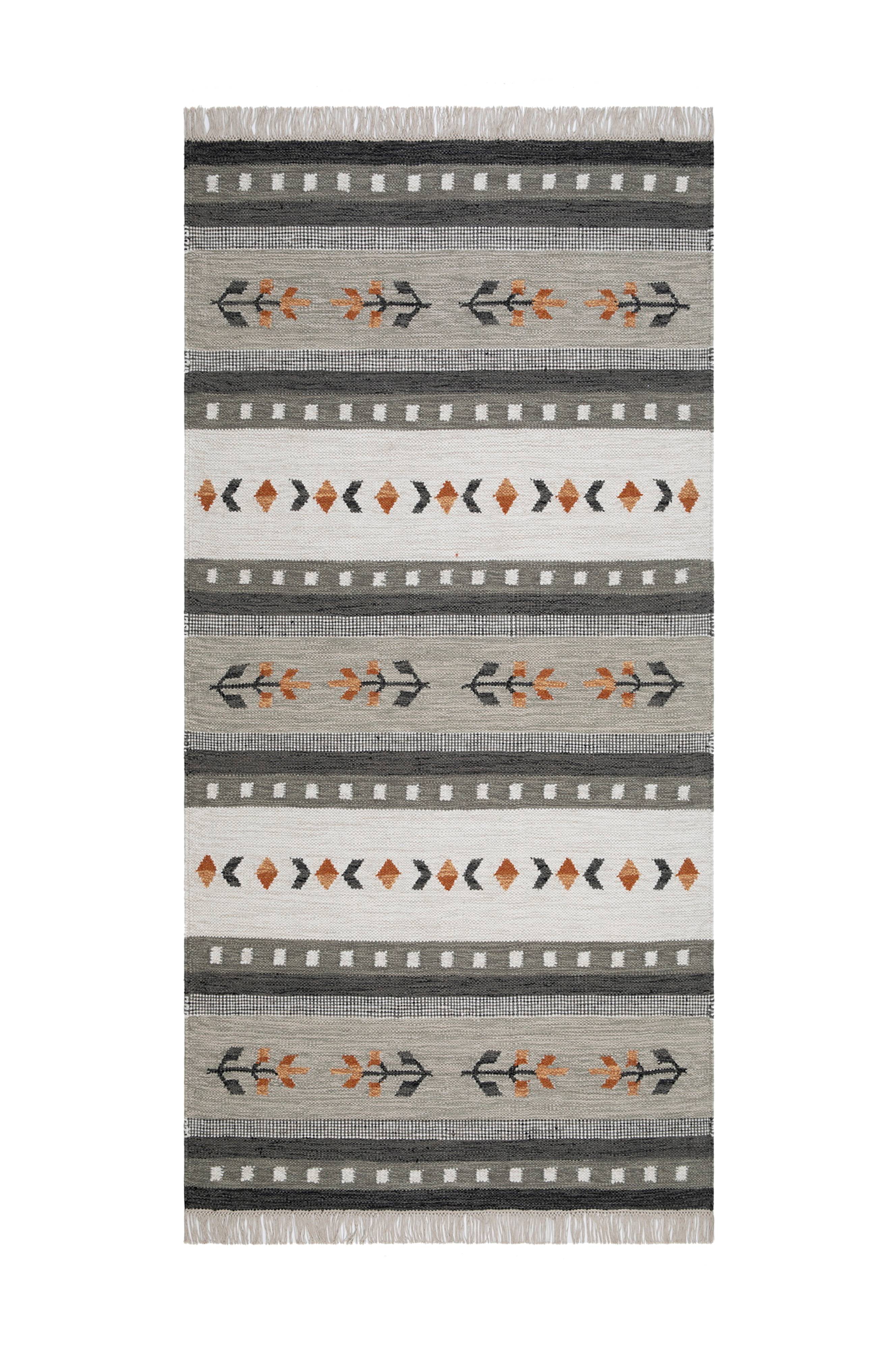 Röllakanteppe i ull i et klassisk röllakan-mønster. Teppet er vevd på en varp av bomull, noe som gir tynne vakre frynser.