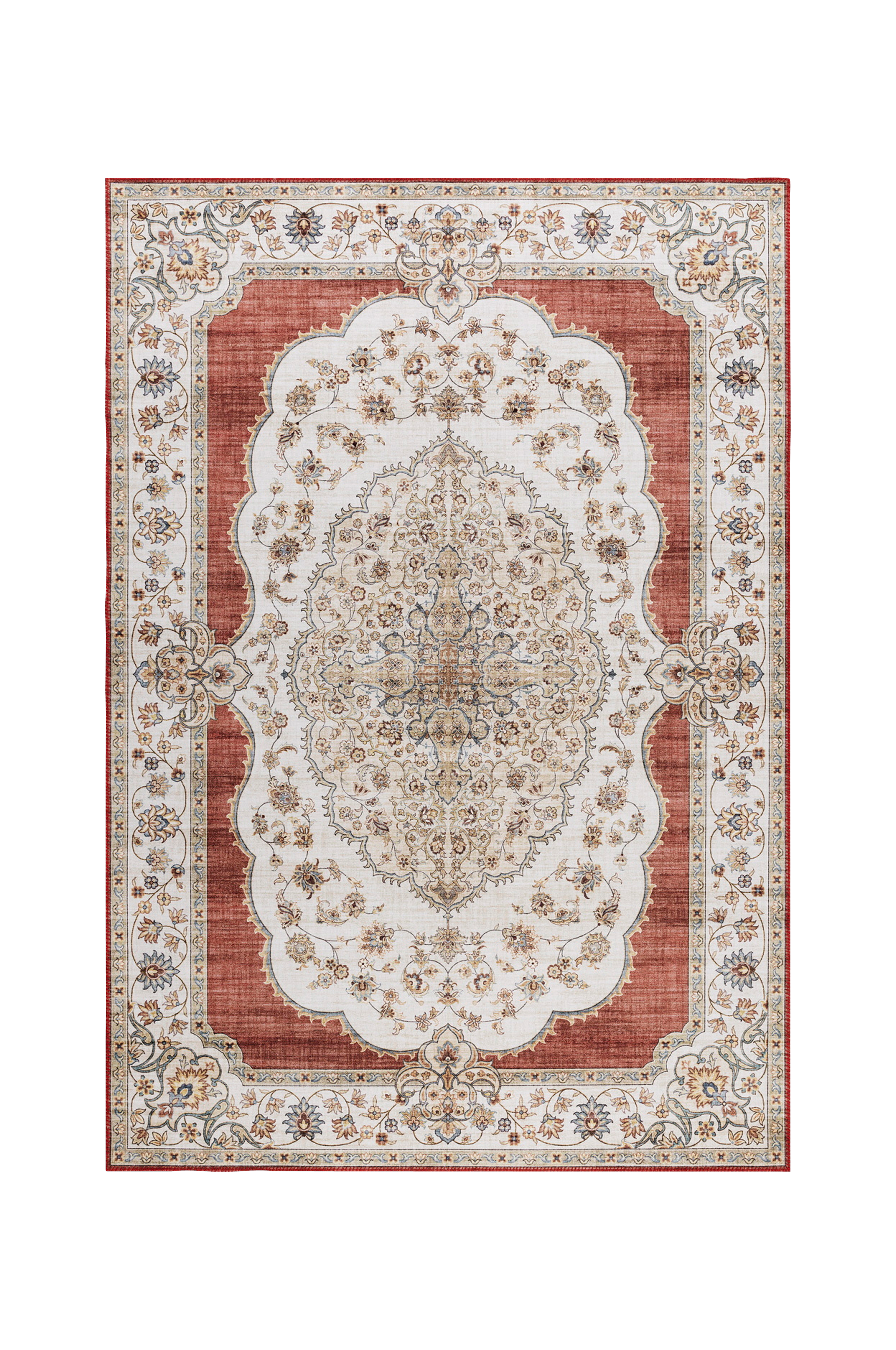 Teppet er tynt og lett, noe som gjør det enkelt å håndtere, samtidig som den sklisikre baksiden holder det sikkert på plass. Kantene er sirlig avsluttet med dekorative sømmer for et raffinert utseende.