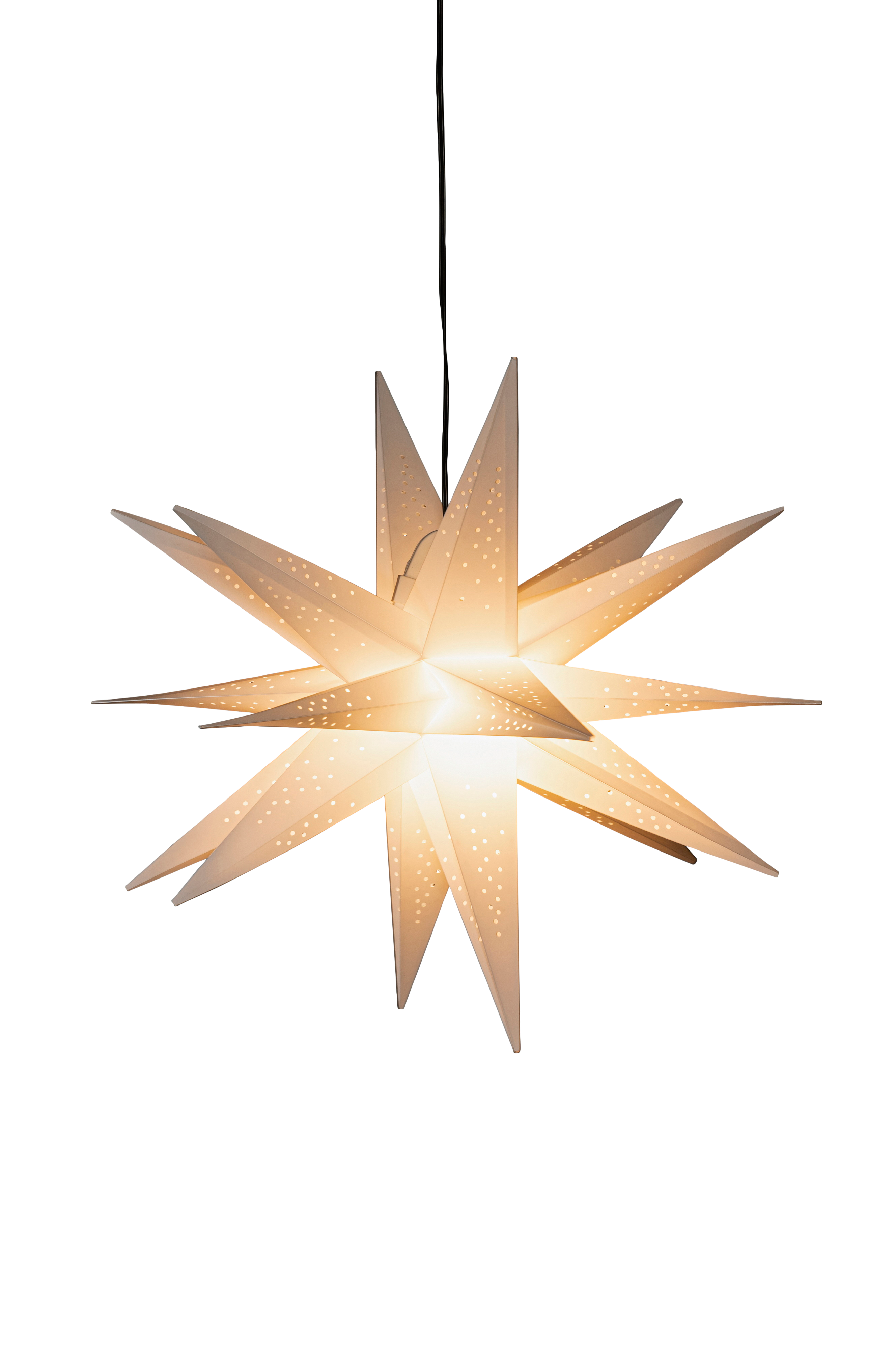 3-d plaststjerne i hvitt for utendørs bruk med varmhvit LED. Inkludert transformator med innebygd dimmer. Lyspære er ikke inkludert. Tilkoblingsledningen er 5 m. Høyde 60 cm