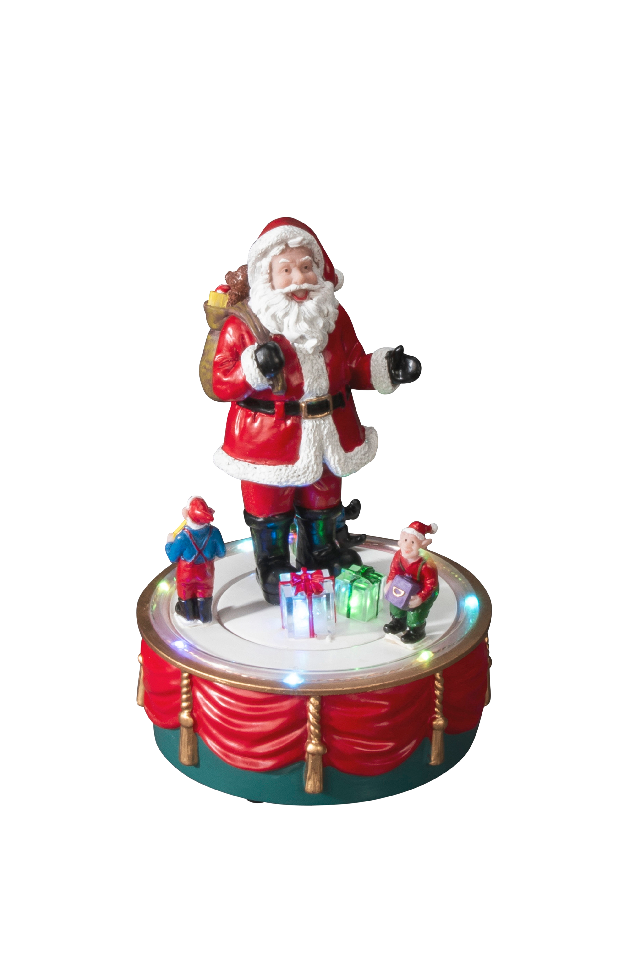 Julenisse med roterende nisser. Dekorasjonen kan brukes med konstant lys, bevegelse og musikk, eller med en 6-timers timer, hvoretter produktet slås av i 18 timer for så å lyse opp igjen neste dag for ekstra festlig stemning. Karusellen har en 6-timers timer, drives av 3xaa-batterier (ikke inkludert), og kan også brukes med den medfølgende usb-kabelen. Bredden er 18,2 cm og høyden er 23,5 cm.