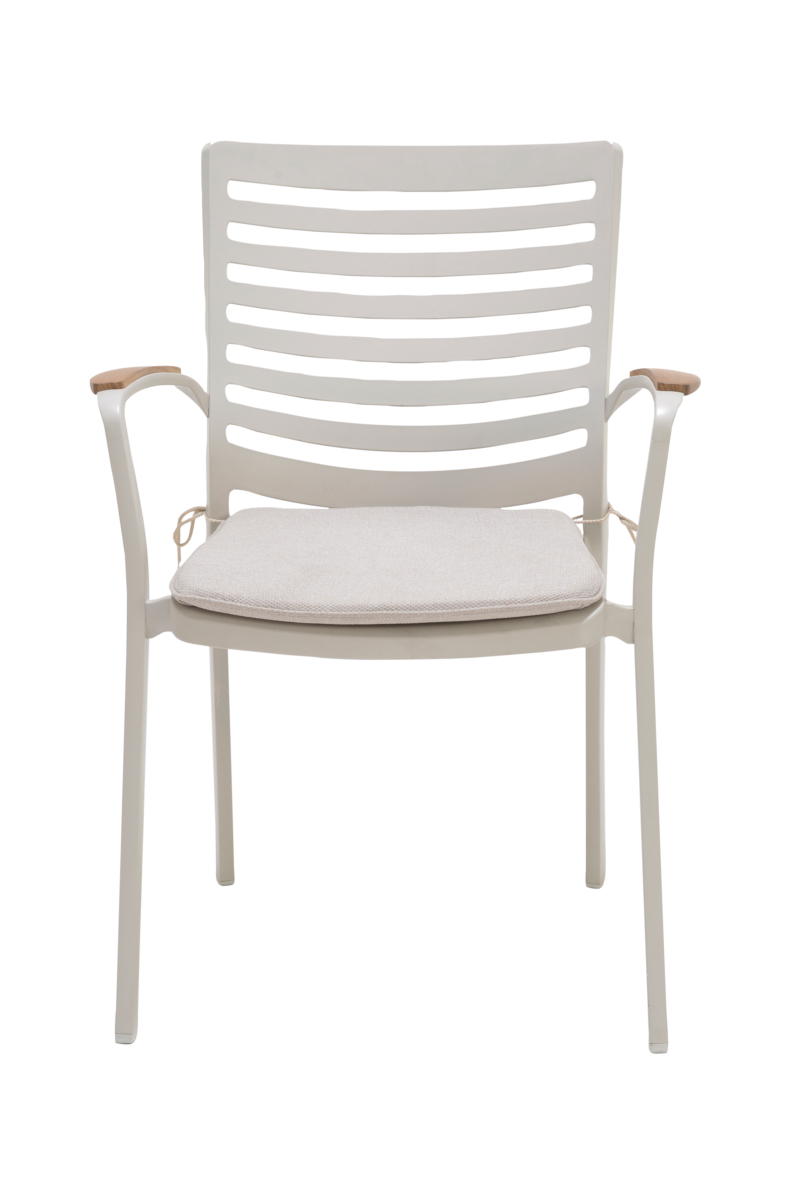 Pulverlakkert aluminium (solid sete og rygg). Overlegen komfort, slipt finish i svart. Svært slitesterk med armlener i FSC-teak. Stabelbar. Pute i olefin à 240 g følger med