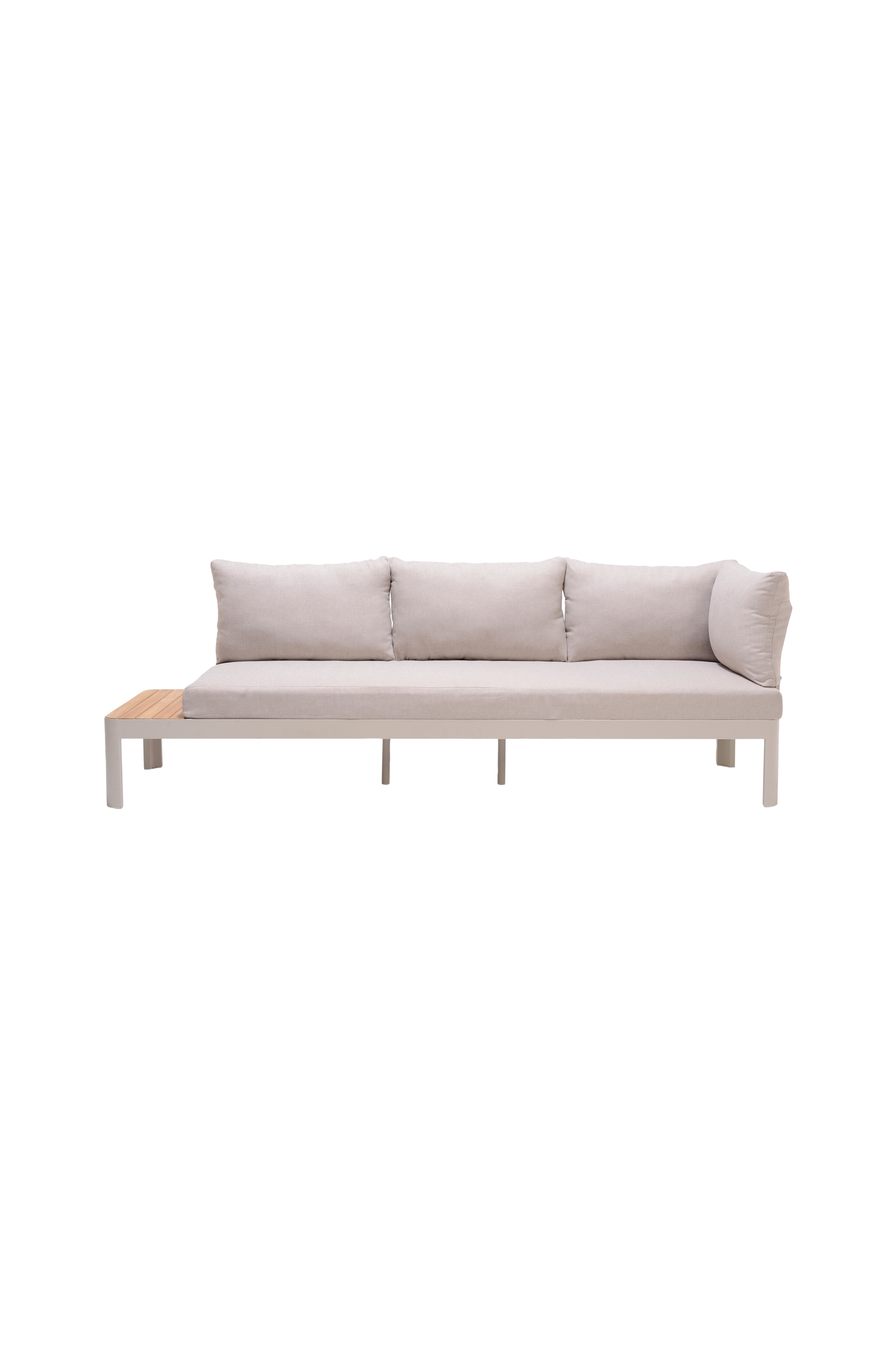 Modulbasert sofakonsept: uendelige kombinasjonsmuligheter med avtagbar rygg. Bordlameller i teak. Puter i olefin 240gr inkludert.