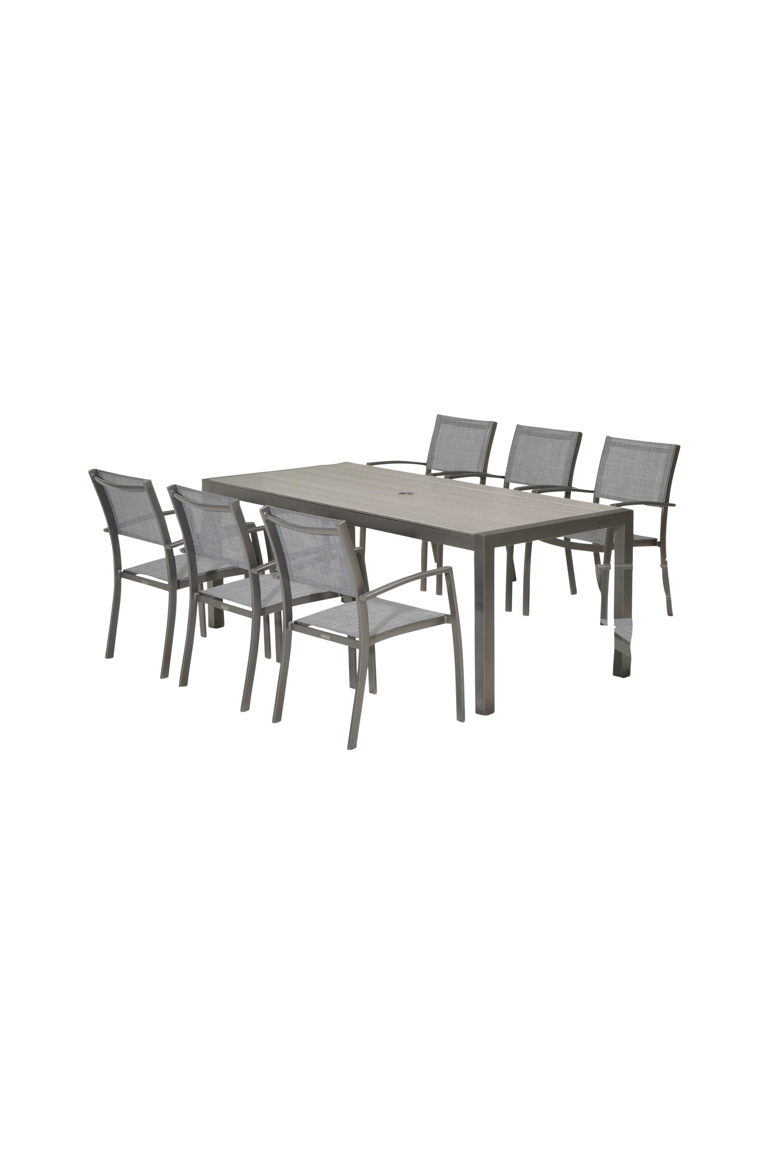 Behagelig og lettstelt sett med 6 stabelbare armstoler og rektangulært bord 201x88 cm med bordplate av duraboard (ripe- og flekkbestandig) og rustfrie stammer av aluminium. 100% vedlikeholdsfri. For 6-8 personer.