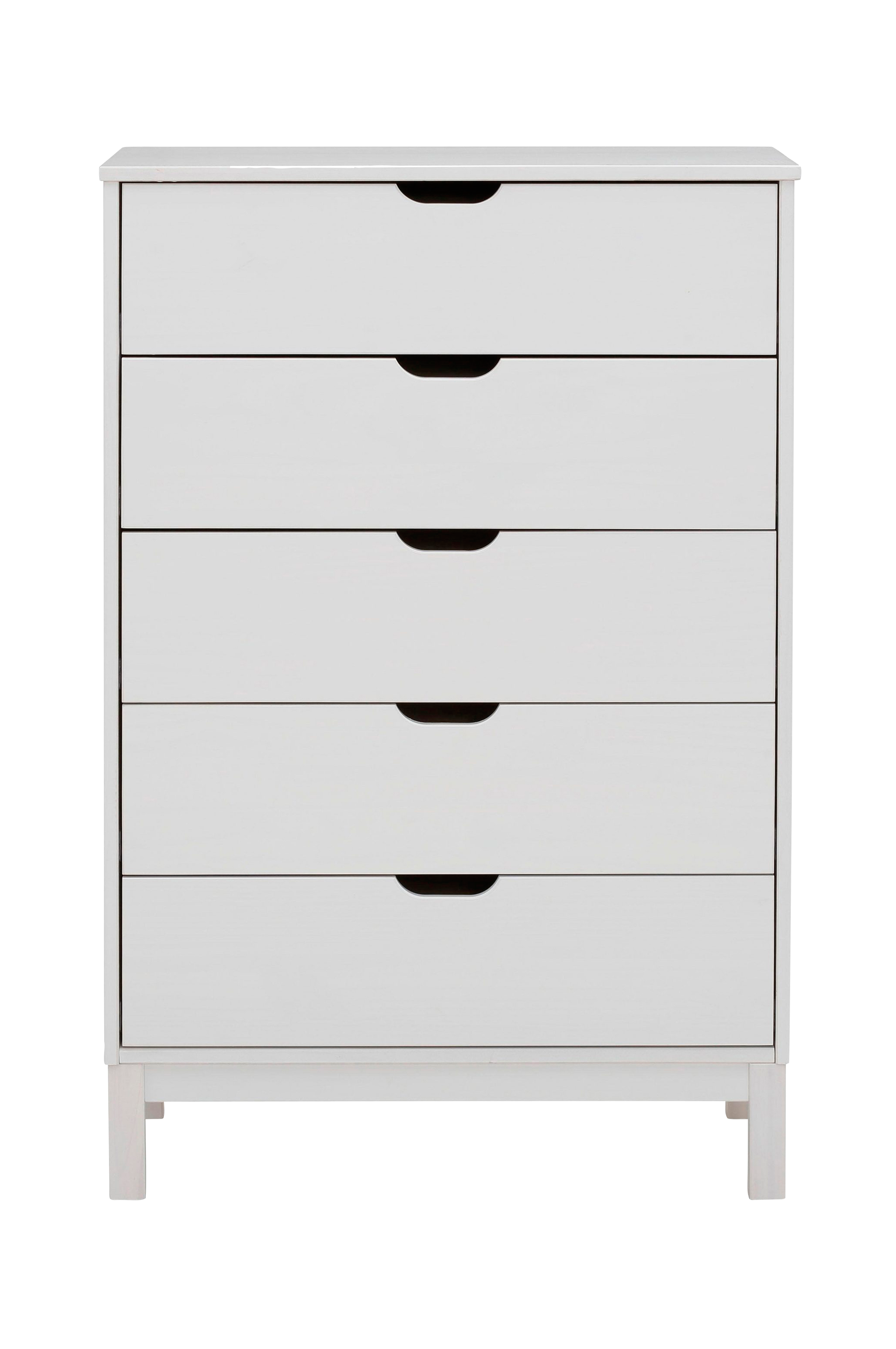 Kommoden i moderne landlig stil inspirerer med sitt naturlige treutseende. Blant designelementene er de utfreste, innfelte grepene som gir skjenken sin sjarm. I tillegg til designen scorer møbelet med sin oppbevaringsplass: I de romslige skuffene er det plass til å oppbevare forskjellige ting. På soverommet egner skapet seg godt som lintøykommode. Alternativt kan oppbevaringsmøbelet på barnerommet brukes som lekekommode. Massivtreet som brukes er fsc-sertifisert. Ved behov kan de lettstelte overflatene enkelt rengjøres.