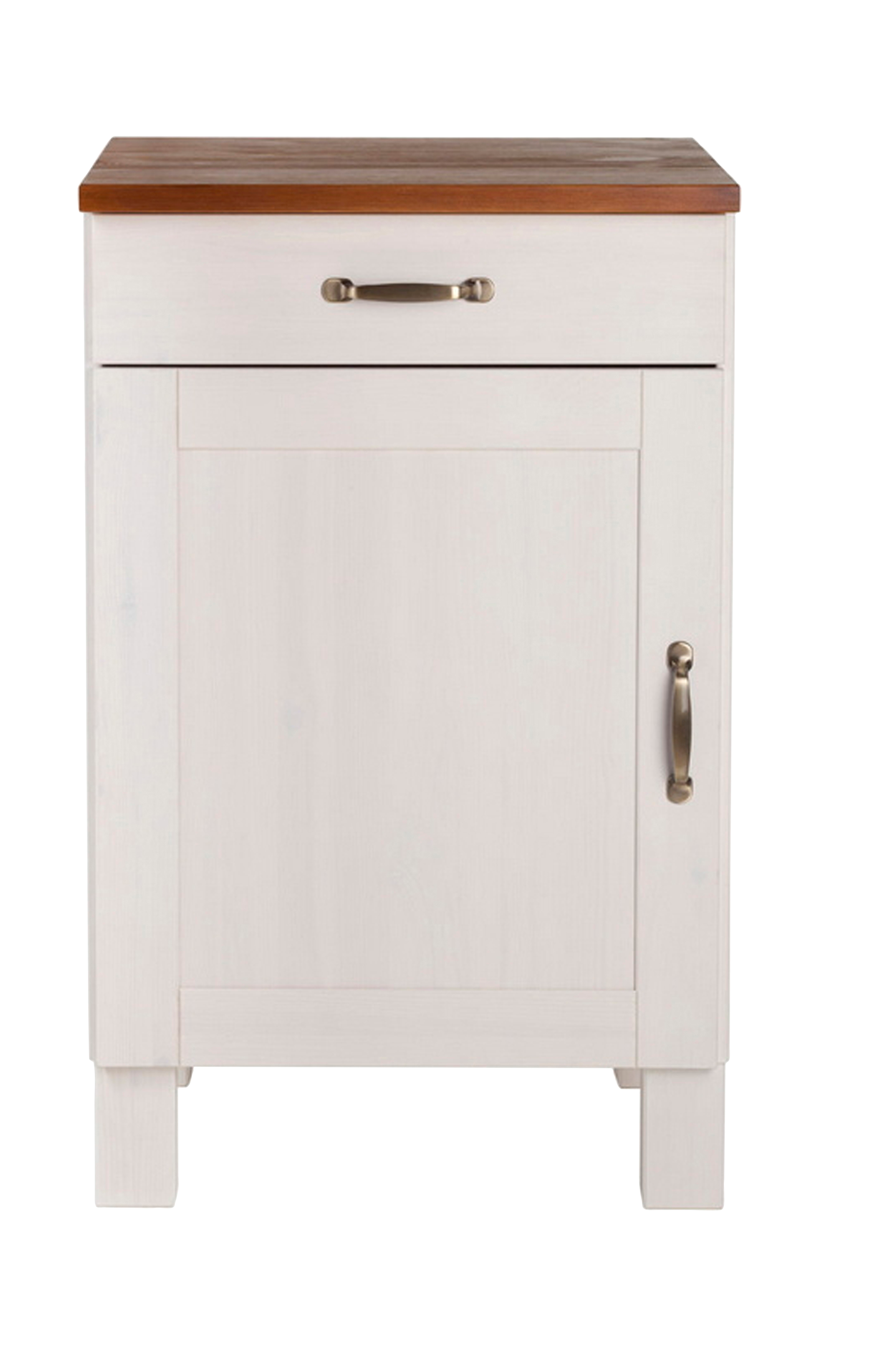 Nye impulser på kjøkkenet: Det visuelt tiltalende underskapet overbeviser med sin attraktive design i landlig stil. Benkeplaten og korpus er laget av heltre furu, treet som brukes kommer fra godt forvaltede skoger og er fsc-sertifisert. Skapet er tilgjengelig i forskjellige farger. Kjøkkenskapet har en skuff og to skaprom som er delt av en flyttbar hylle. Både skuffen og skapdøren kan åpnes og lukkes med dekorative metallhåndtak og avrunder den vellykkede designen. Kjøkkenunderskapet skaper en koselig atmosfære i trendy landlig stil.
