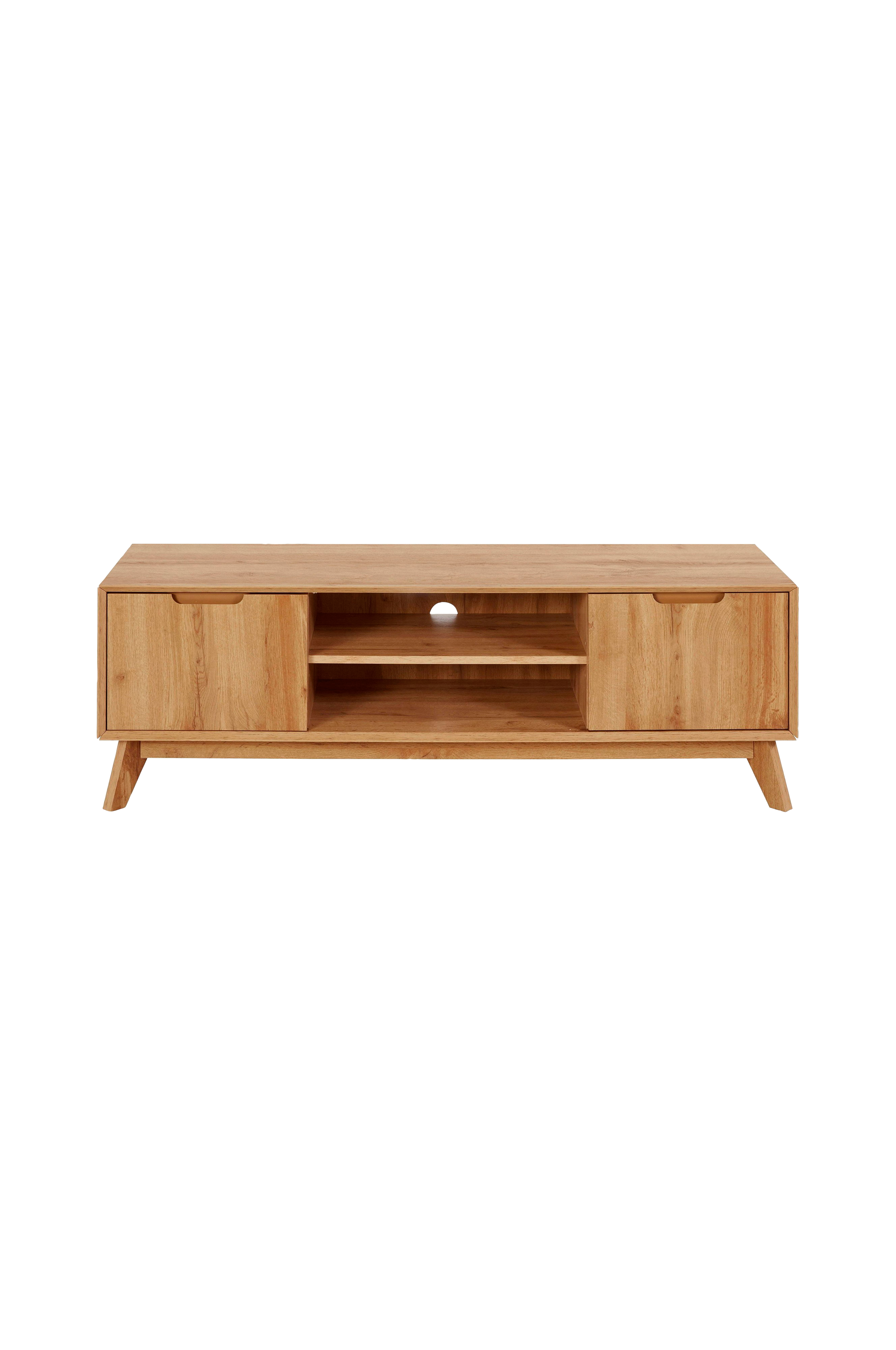Med sin lave høyde utfyller denne tv-hyllen med to dører stuen din på en stilfull og funksjonell måte. Media- eller lydanleggene dine er i gode hender, for det har en kabelåpning på baksiden. De to åpne hyllene kan brukes variabelt, slik at du selv kan bestemme høyden på de enkelte rommene. Det stabile trematerialet som skjenken er laget av, gjør møbelet spesielt slitesterkt og har den fordelen at det ikke vrir seg. Håndtakene er holdbare og tilfører stil. Ditt nye møbel kan belastes med opptil 50 kg. Treet passer godt sammen med andre naturmaterialer og sarte farger som krem, beige eller grått.