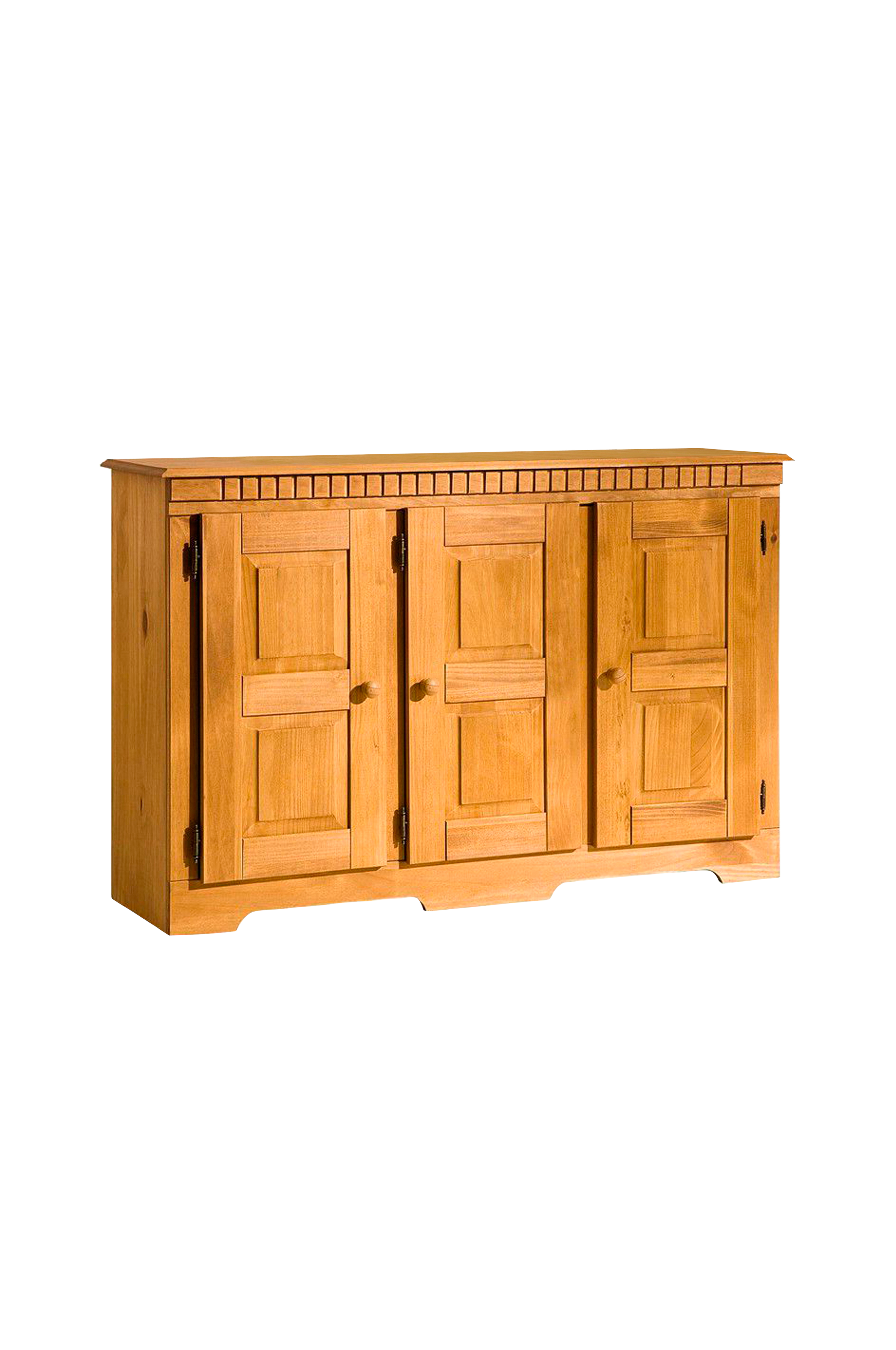 Tredesign med mange detaljer - skjenken imponerer med sine mange små detaljer og den vellykkede utførelsen. Det fsc-sertifiserte furutreet i kombinasjon med de individuelle årringene understreker det solide inntrykket av skjenken. Avflatete kanter, elegante hengsler, runde dørhåndtak og ulike dekorative elementer på og i treverket fullfører skjenkens sjarm. Bak tredørene sørger justerbare hyller for orden og rikelig med justerbar oppbevaringsplass. Enten det er i gangen, på soverommet, i spisestuen eller i stuen, gir denne skjenken hvert rom et spesielt preg.