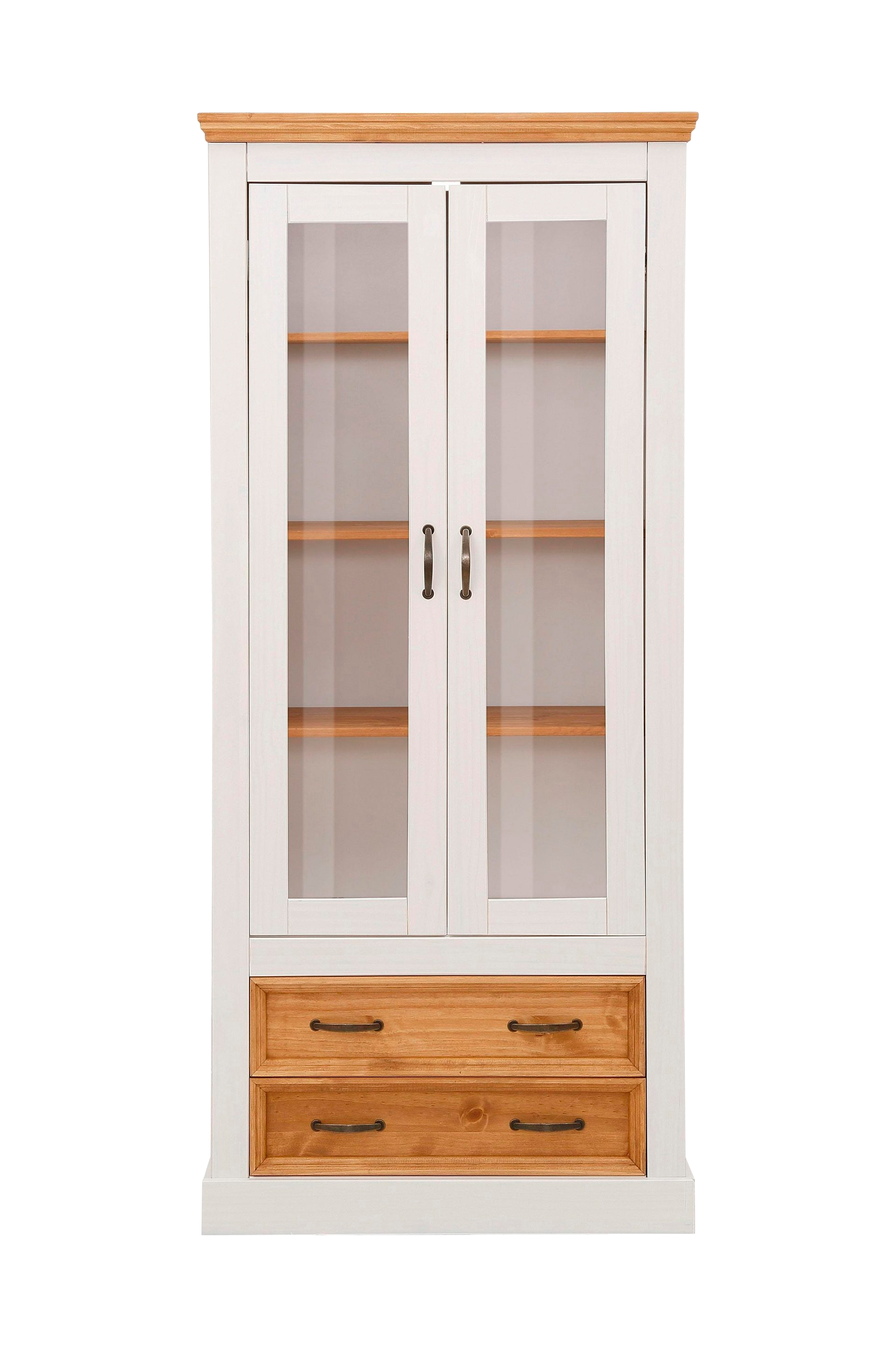 Allsidig og et blikkfang i rommet: Det vakkert designede vitrineskapet er interessant på flere måter. Det kan settes opp som et enkeltstående møbel i rommet eller kombineres med andre møbler i en moderne landlig stil. Vitrineskapet er laget av fsc-sertifisert massivtre av høy kvalitet. Korpus og front er tilgjengelig i forskjellige farger. Den synlige trestrukturen understreker det vakre utseendet. Skapdørene og skuffen åpnes med et stilig håndtak i antikkfarget metall. Hengslene og skinner er også laget av metall og er tilsvarende stabile.