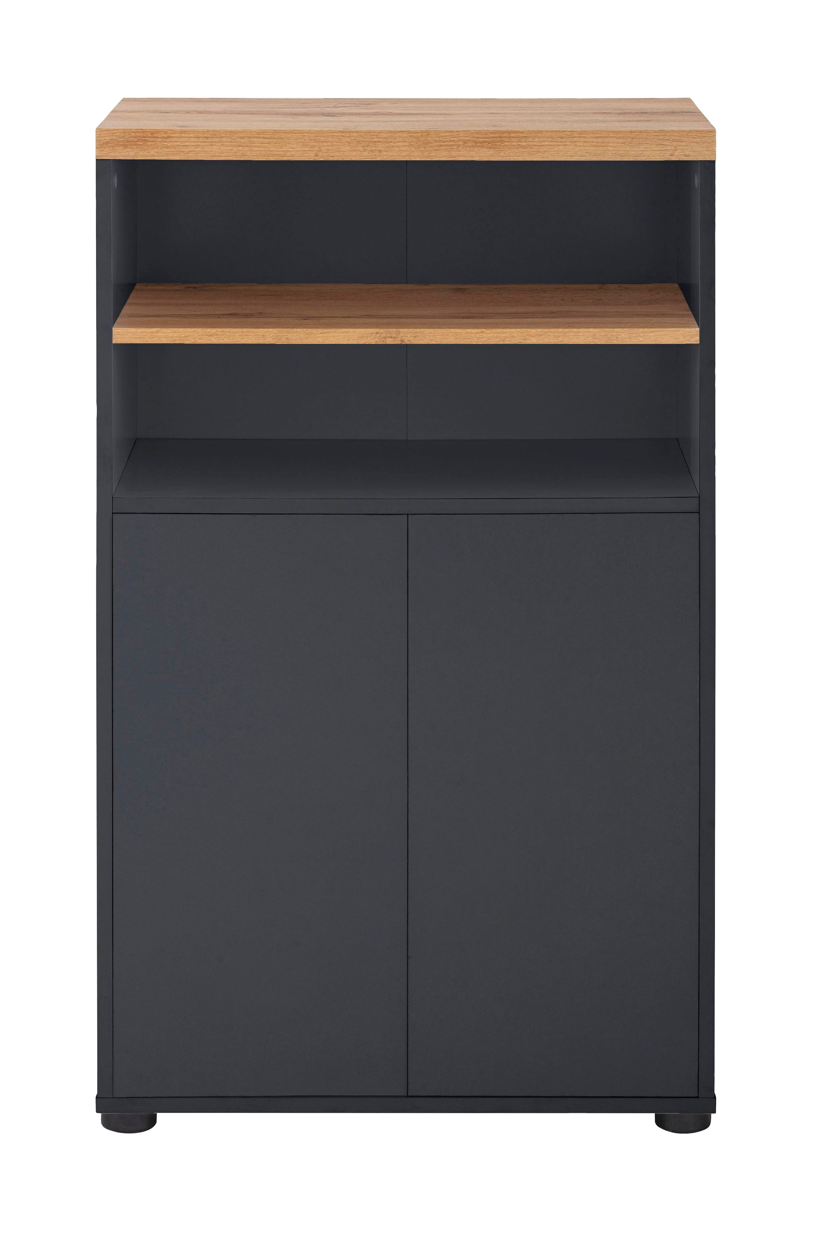 Dette skapet med push-to-open-funksjon er et dekorativt høydepunkt i ethvert rom. Det har et moderne design og er dekorert med vakre elementer i tre-look. Integrerte rom gir praktiske oppbevaringsmuligheter. Det kan også tilpasses perfekt til ditt eksisterende innredningskonsept og harmonerer med ulike boligstiler. Skapet har en lettstelt overflate som gjør det enkelt å rengjøre. Materialet for montering er inkludert, slik at det kan settes sammen og settes opp raskt.