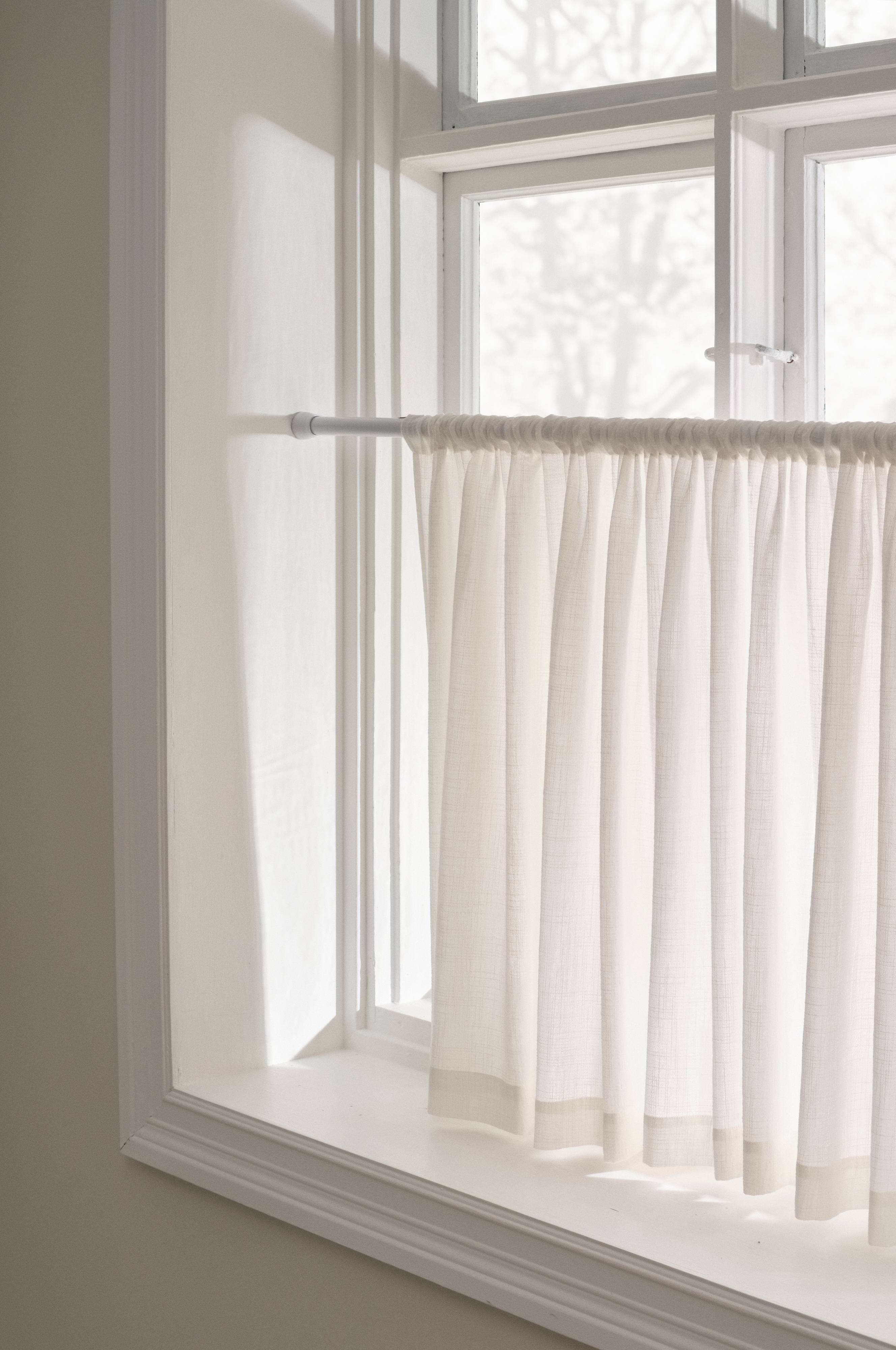En kafégardin i luftig stoff med melert effekt. Stoffet er vevd i bomull og har en fin, avslappet følelse. LUNI café-gardin har en påsydd kanal øverst, og den henges på en gardinstang nederst i vinduet og gir dermed privatliv samtidig som lyset kommer inn over gardinen, herlig å alltid kunne se himmelen.