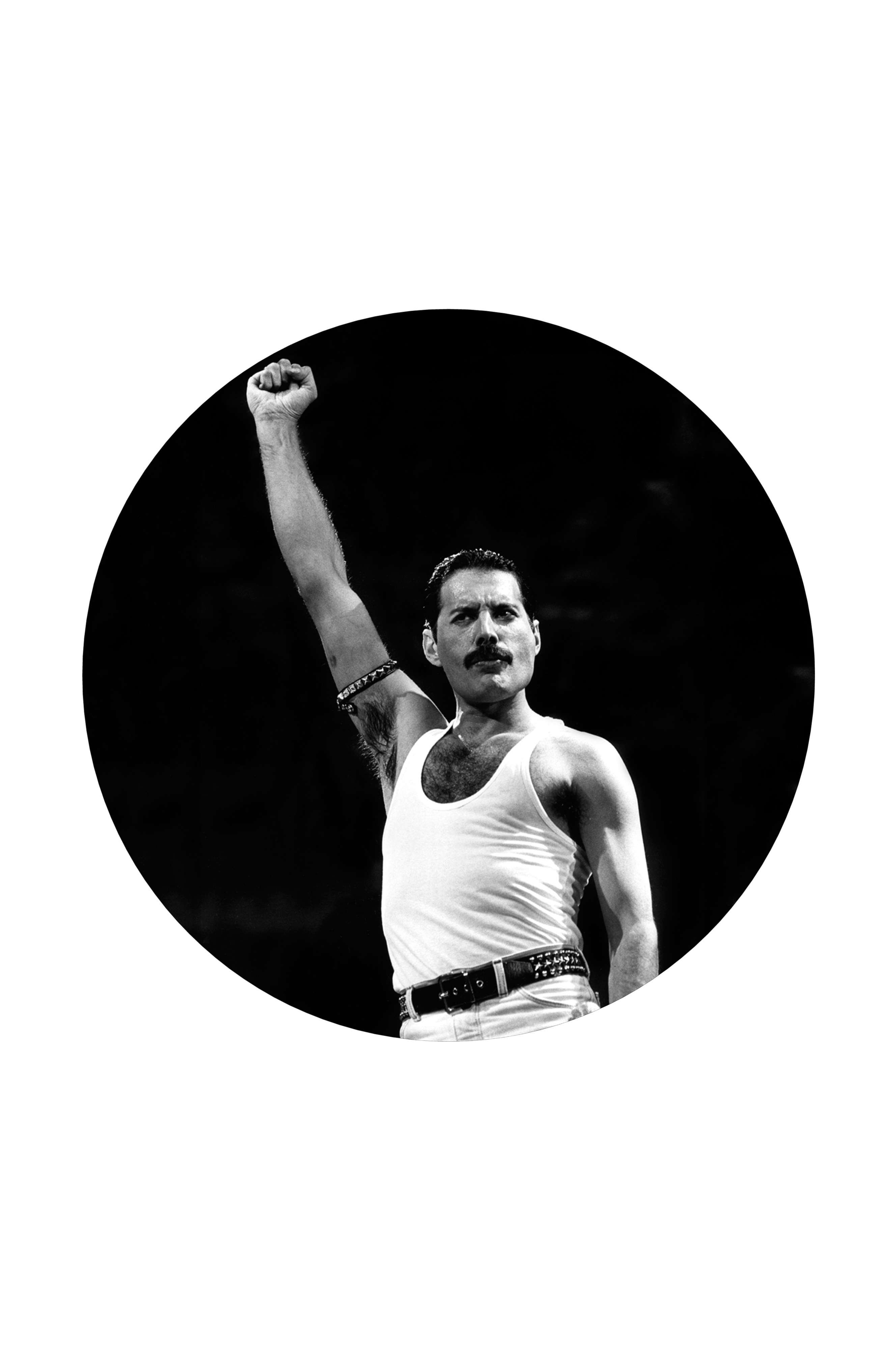 Bilde Freddie Mercury fra Malerifabrikken. Trykt på rund MDF-plate. Når bildet henger på veggen gjør profilen på platen at fronten «svever» ca. 0,5 cm fra veggen.