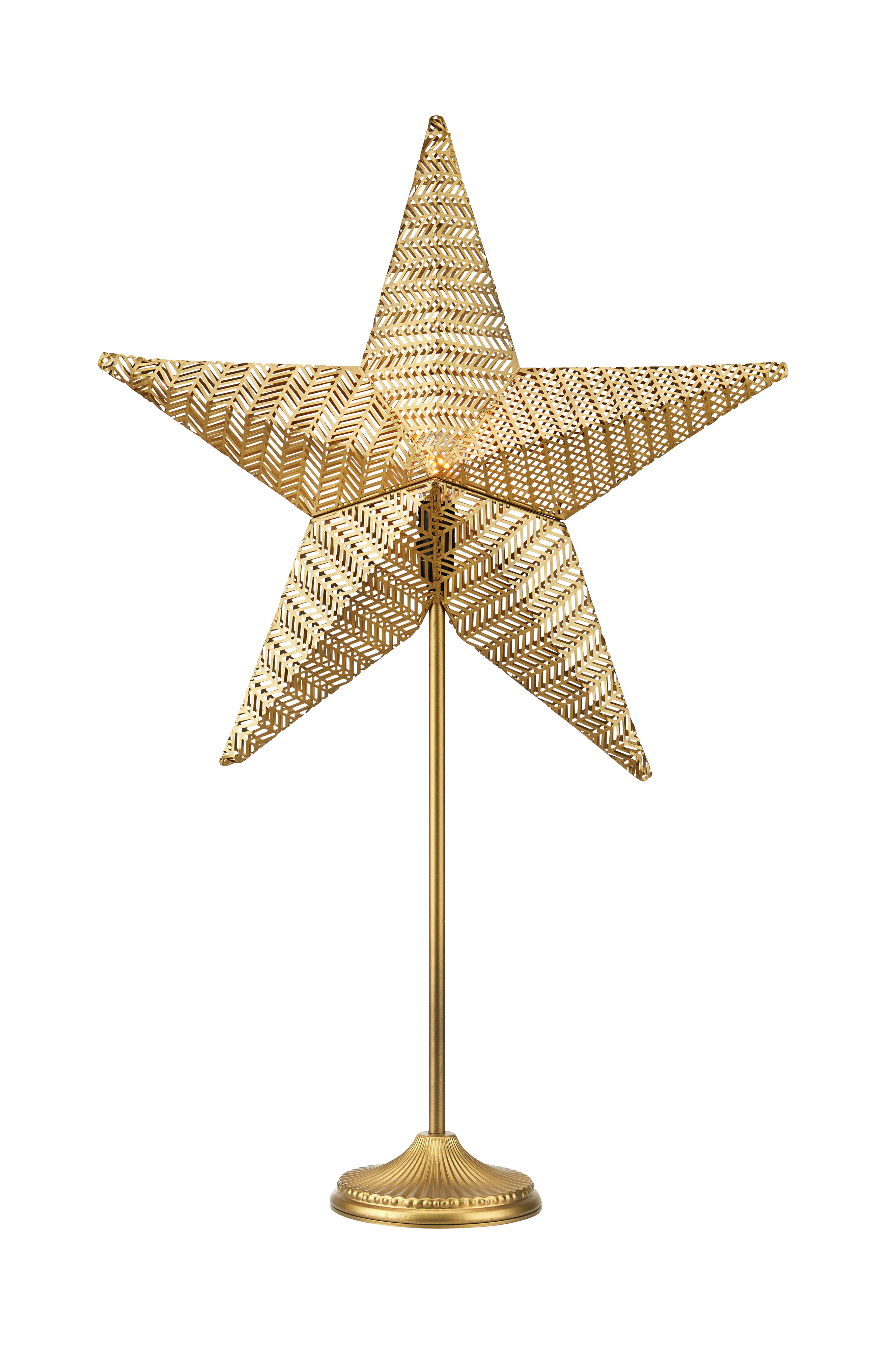 Bordstjerne helt i metall. 2 meter ledning i plast, med strømbryter på ledningen, og støpsel. Liten sokkel (E14), maks 25W eller tilsvarende i LED. Lyspære inkludert.