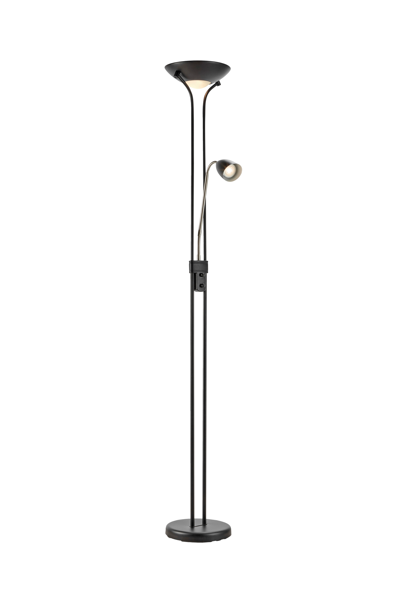 Modu gulvlampe fra markslöjd. Gulvlampen har to lys - en oppadvendt og en justerbar leselampe med utskiftbar led-modul - som gjør den både dekorativ og funksjonell. Dimmer på sokkelen gir full kontroll over lysstyrken. 180 cm høy med 2 meter svart pvc-kabel og veggplugg. Klasse II-sertifisert, perfekt som leselampe ved sofaen eller som omgivelsesbelysning. Led-modulen i leselampen er utskiftbar, artikkelnummer 109192.