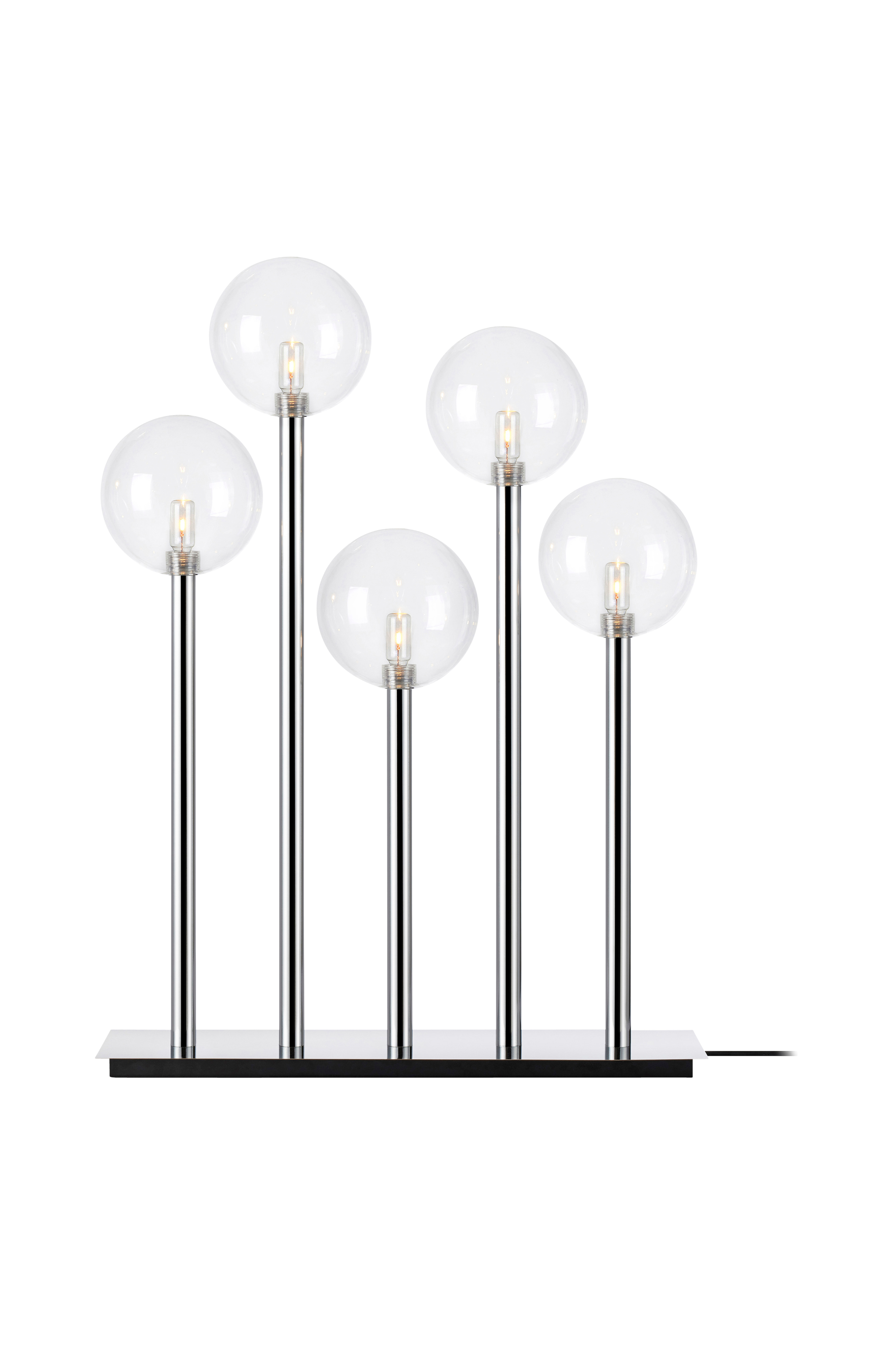 Femarmet lysestake i metall. Lysene har forskjellig høyde med klare glasskupler. Lampen krever fem lyspærer med E10-sokkel på maks 3W, inkludert. Lengde 44 cm, bredde 12 cm og høyde 60 cm. Ledningslengde 200 cm med bryter på ledningen.