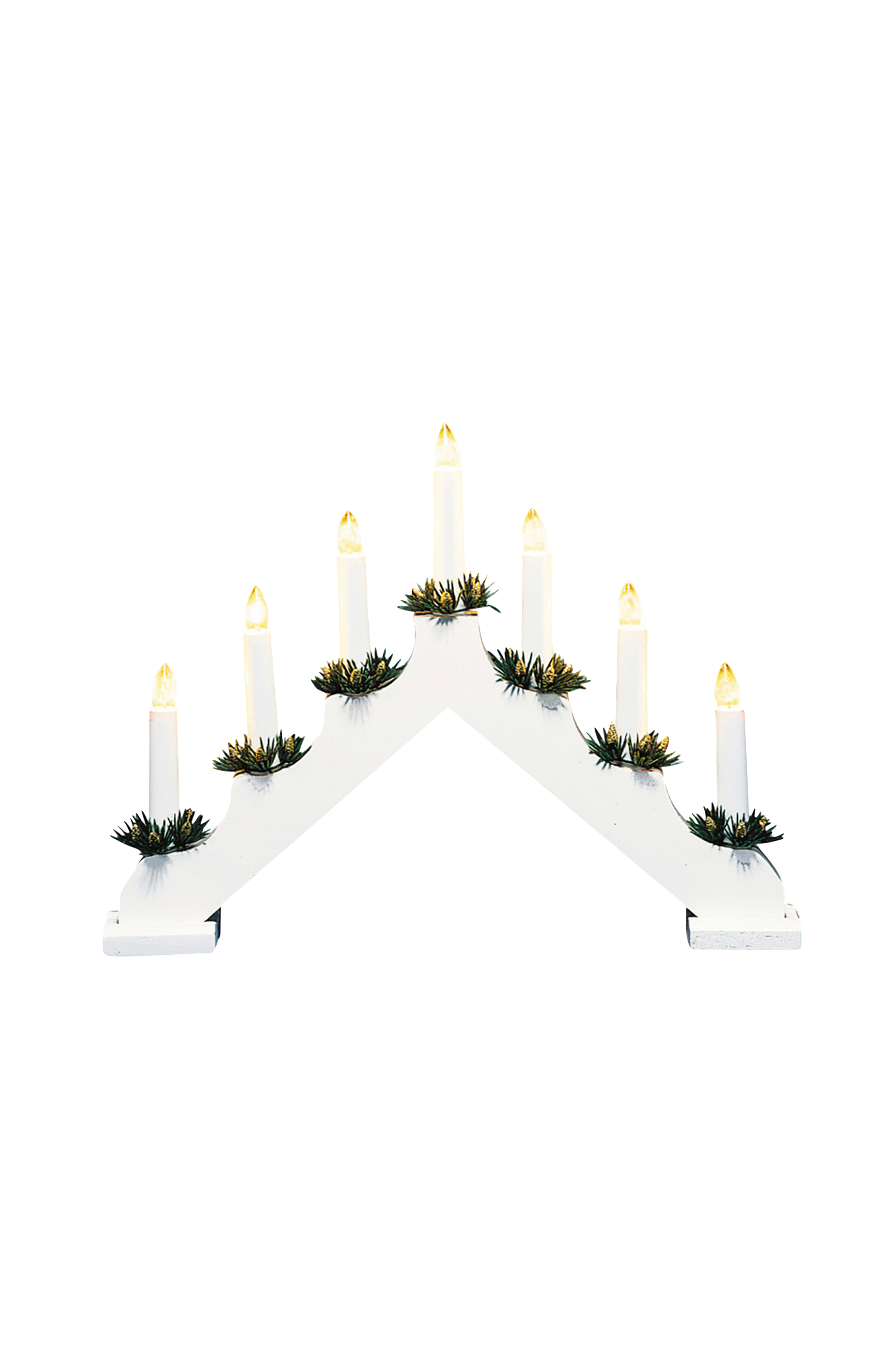 Ola lysestake fra Markslöjd. Base i tre og lys i plast. 7xE10 sokkel. Maks. 3W. 1,5 m hvit ledning i plast med strømbryter på ledningen og støpsel. Lyspærer inkludert.