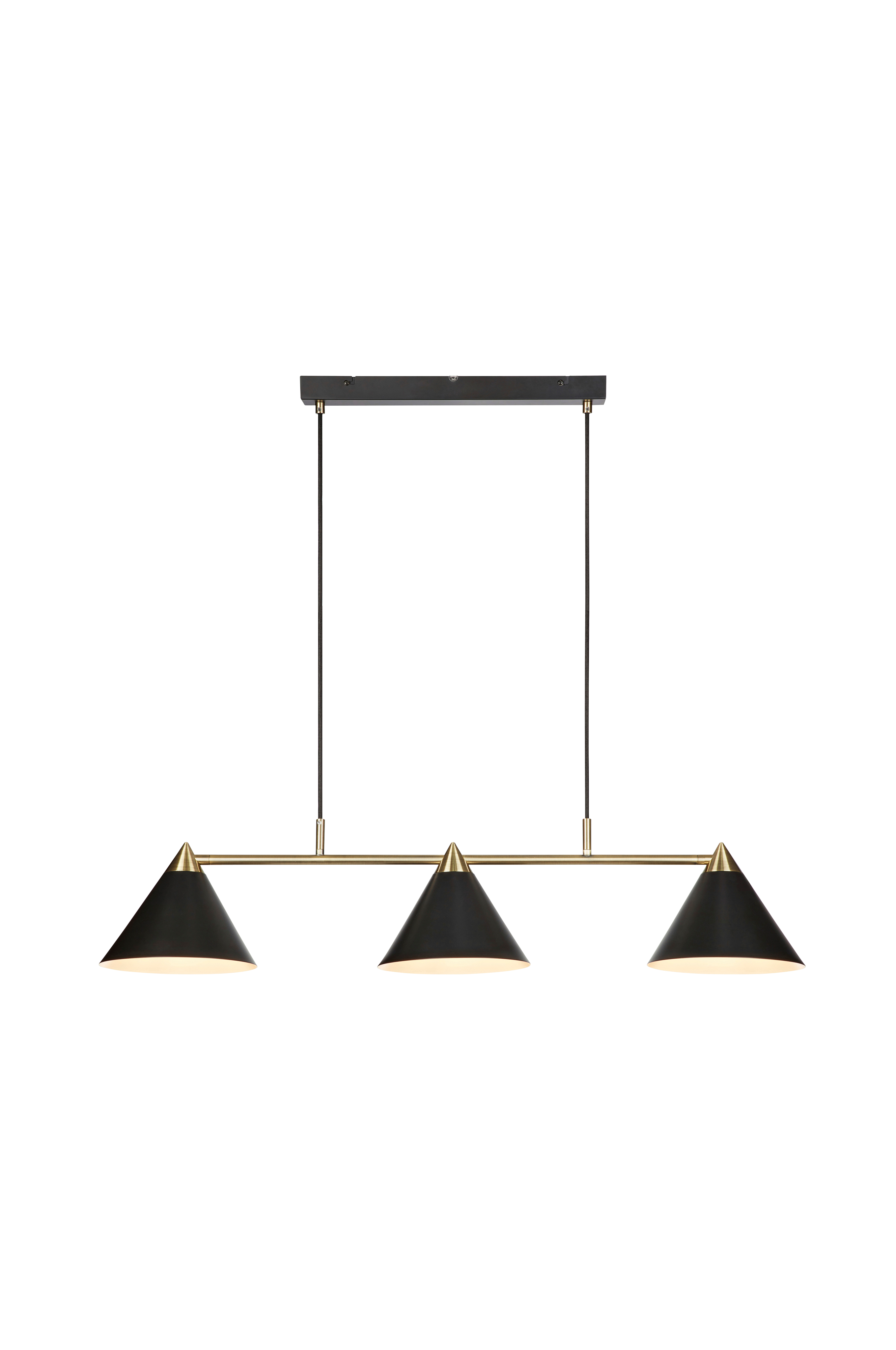 Taklampe med pent kjegleformede skjermer i matt metall. Design av Monika Mulder. Armaturen krever glødepærer med sokkel (E14) på maks 60W eller tilsvarende i LED. Ikke inkludert. 1,5 meter tekstilledning. Takkontakt og lyspære er ikke inkludert. Ikke jordet.