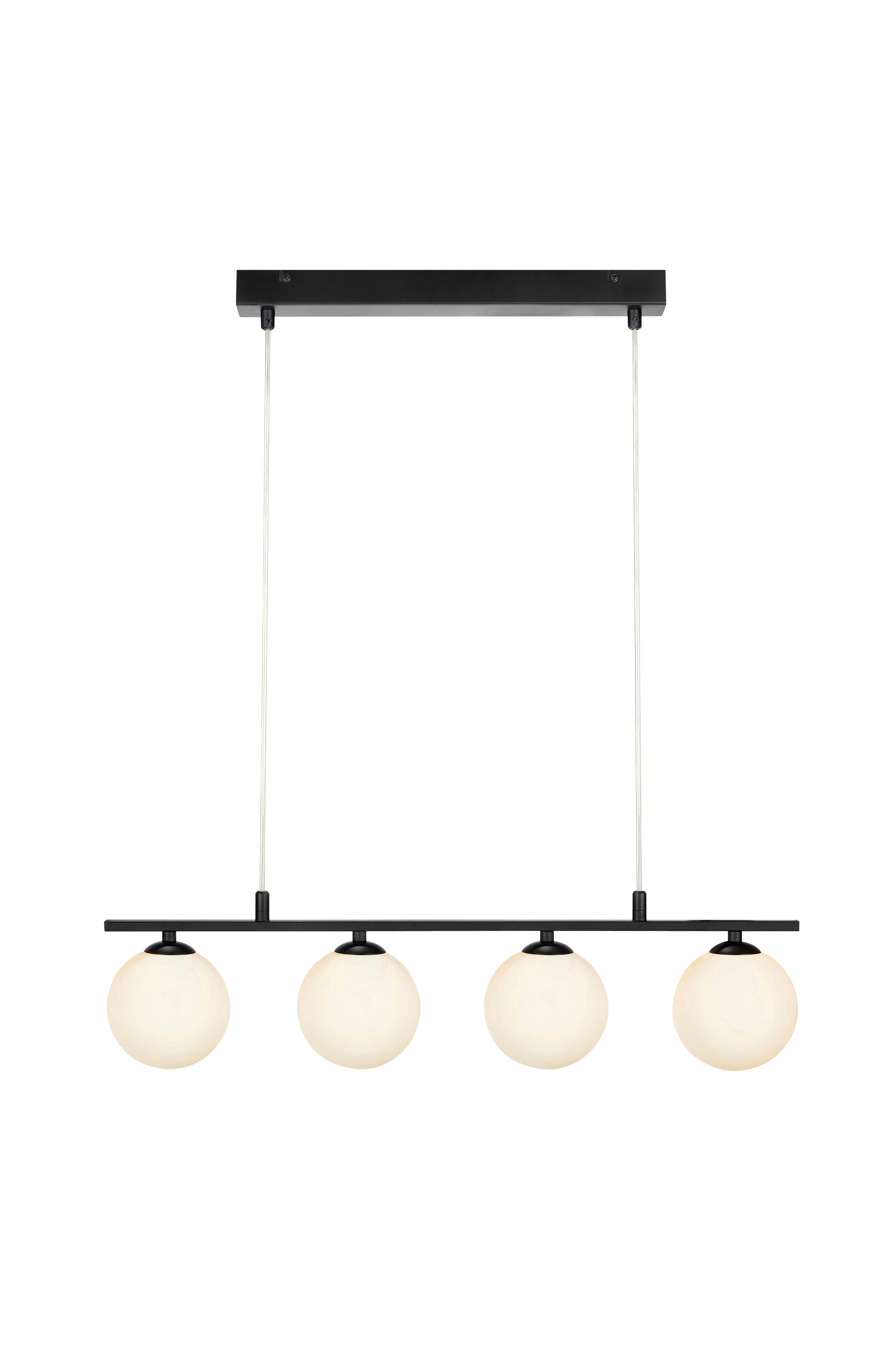 Taklampe i metall med fire hvite glasskupler. Fire lyspærer med G9 sokkel (lyspære ikke inkludert). Bredde 66 cm, kuppel diameter 12 cm og høyde 17 cm. Lyspærer er ikke inkludert.