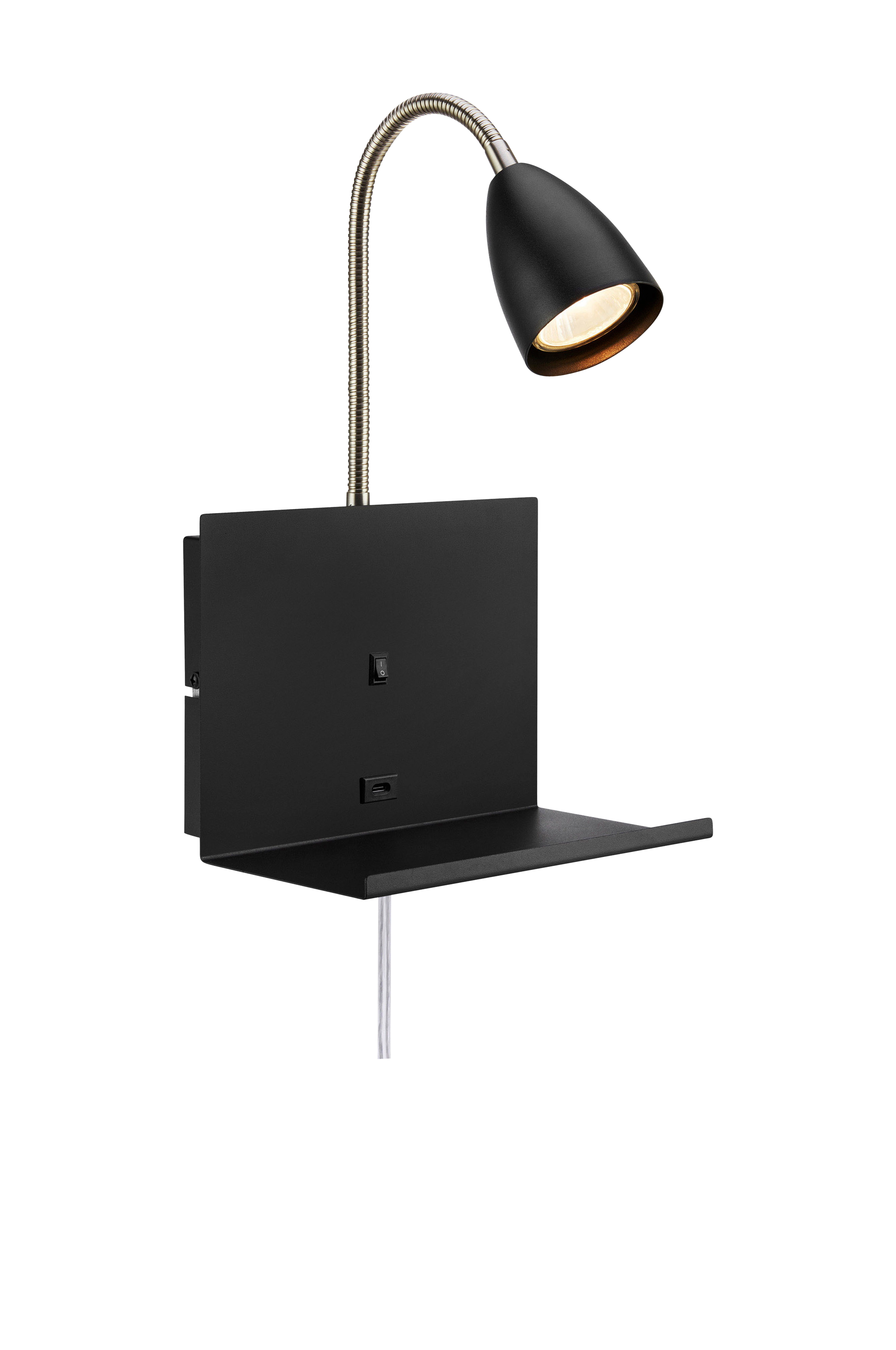 Cuarto vegglampe fra markslöjd. Vegglampe i metall. Fleksibel leselampe. Innebygd bryter. 2 m gjennomsiktig pvc-kabel med veggplugg. Montert med brakett. USB-c uttak for lading av elektroniske enheter. Tilkoblingsboks i veggplaten, for enkel installasjon på direkte innkommende strøm. 1xgu10, maks 7w. Klasse ii. Lyskilde ikke inkludert.