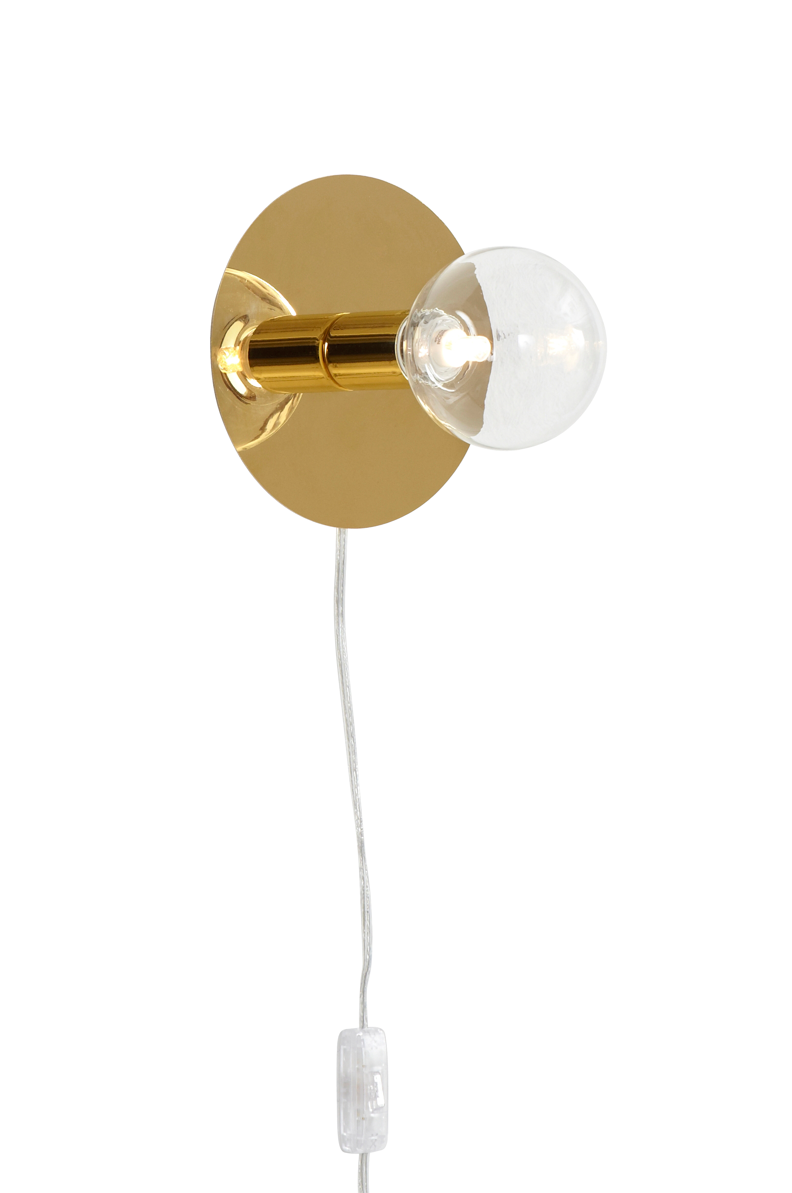 Vegglampe i messingfarget metall. Transparent ledning med strømbryter. Ø 18 cm. Dybde 9 cm. Stor sokkel. Pære inngår ikke. Ulike typer pærer forandrer stilen på din lampe. Prøv deg frem for å finne den du liker best.