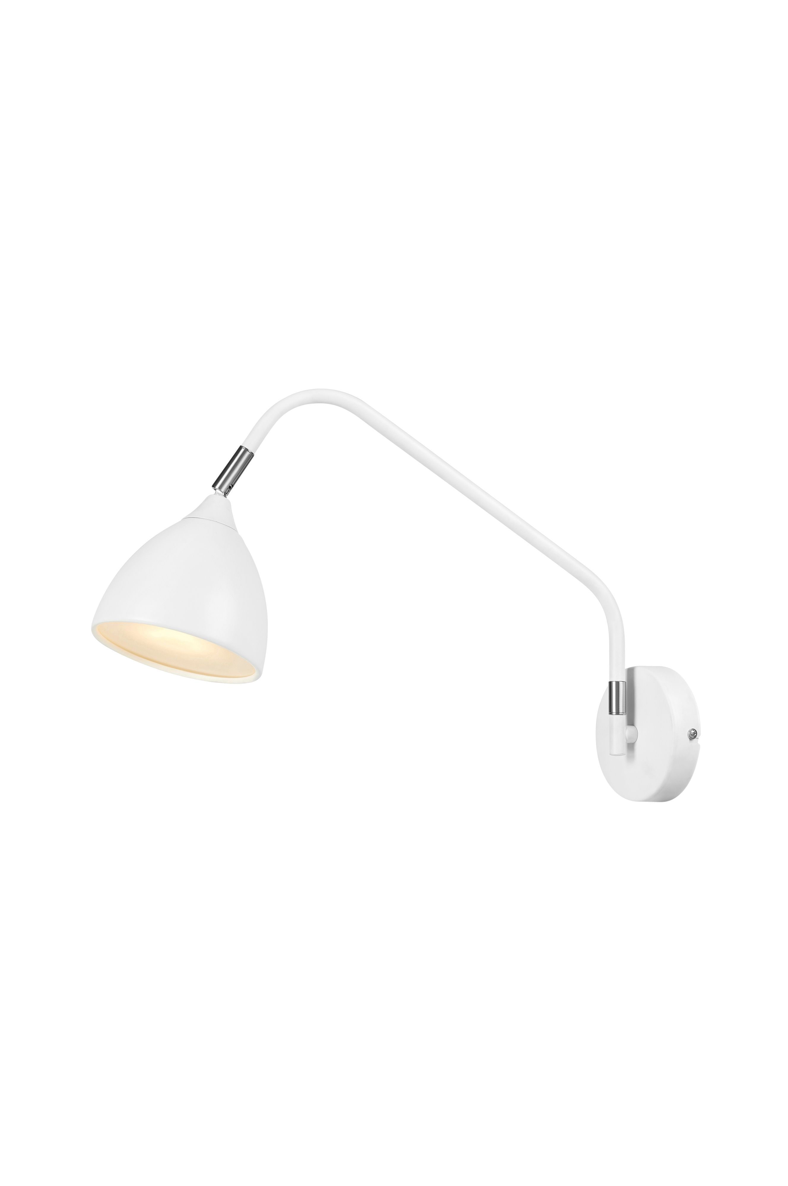 Vegglampe i hvitt metall og forkrommede detaljer. Justerbart lampehode. 2 m ledning med strømbryter på ledningen. Maks 1x6W LED. GU10-sokkel. Lyspære ikke inkludert. 40 cm dyp, 29 cm høy og 12 cm bred.