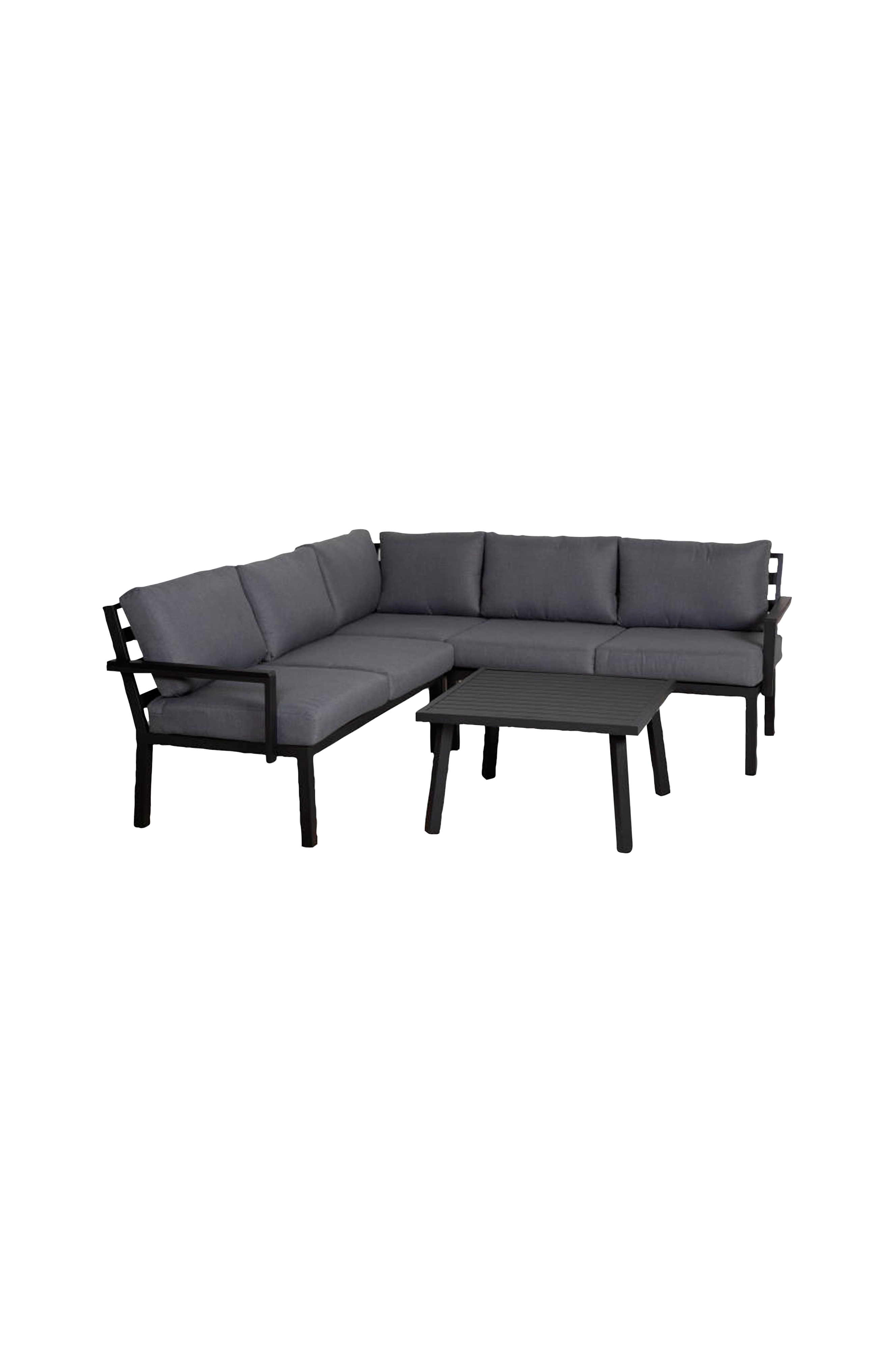 Hjørnesofa 2x2 med ramme i svart pulverlakkert aluminium. Svart aintwood på armlenene. 10 cm tykke grå spunnede polyesterputer. Bordplate i aluminium. Leveres umontert.