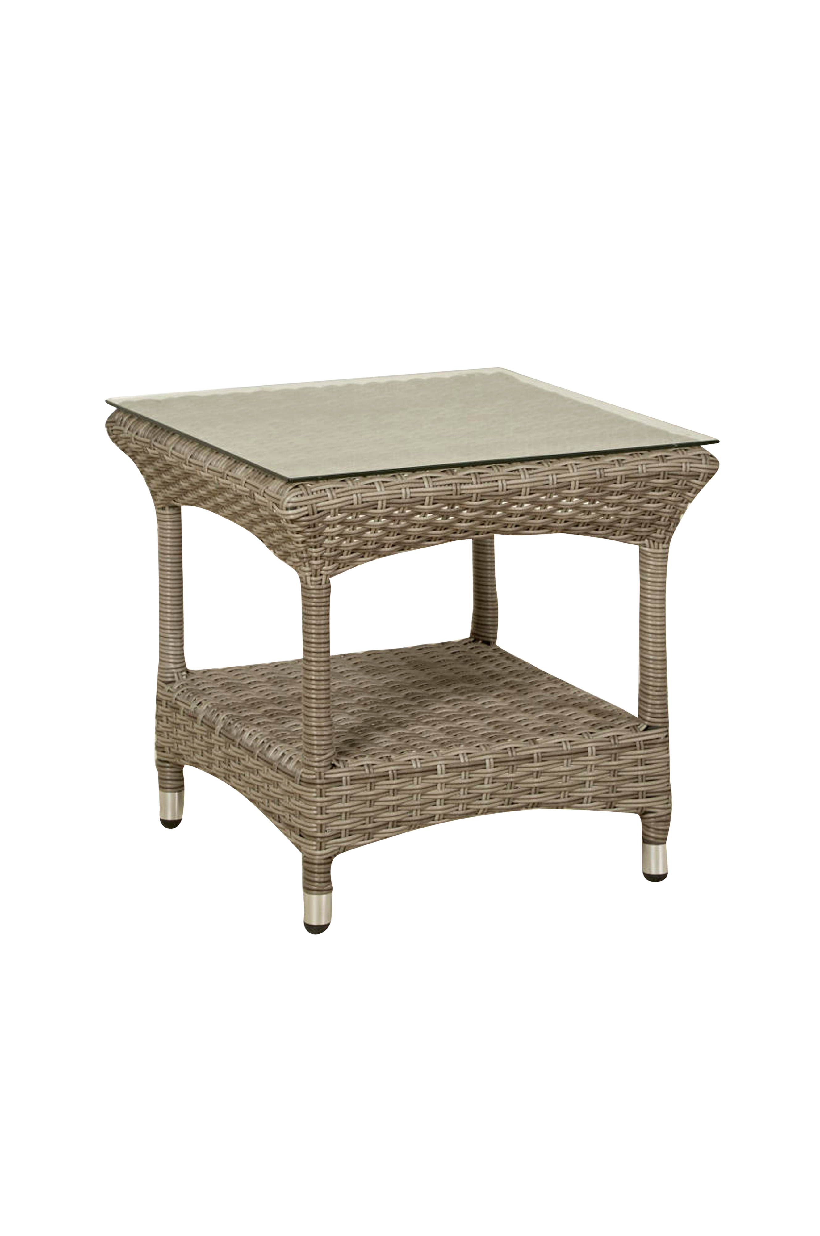 Sidebord med ramme i pulverlakkert aluminium, dobbel, halvrund kurvvev. 5 mm bordplate av glass med hel flettet vev under.