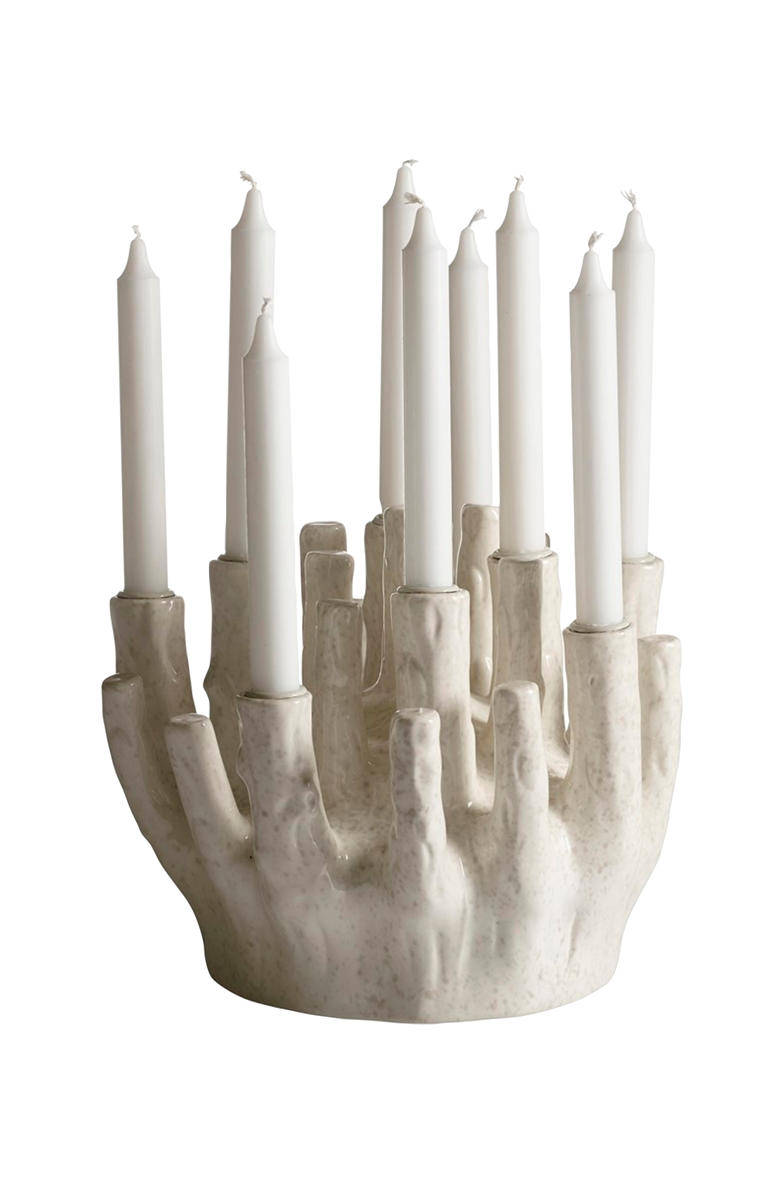 Vakker rustikk håndlaget kandelaber i glasert keramikk med plass til ni lys. Ikke lyskopp på alle armene. Høyde 24 cm. Bredde og lengde 31 cm.