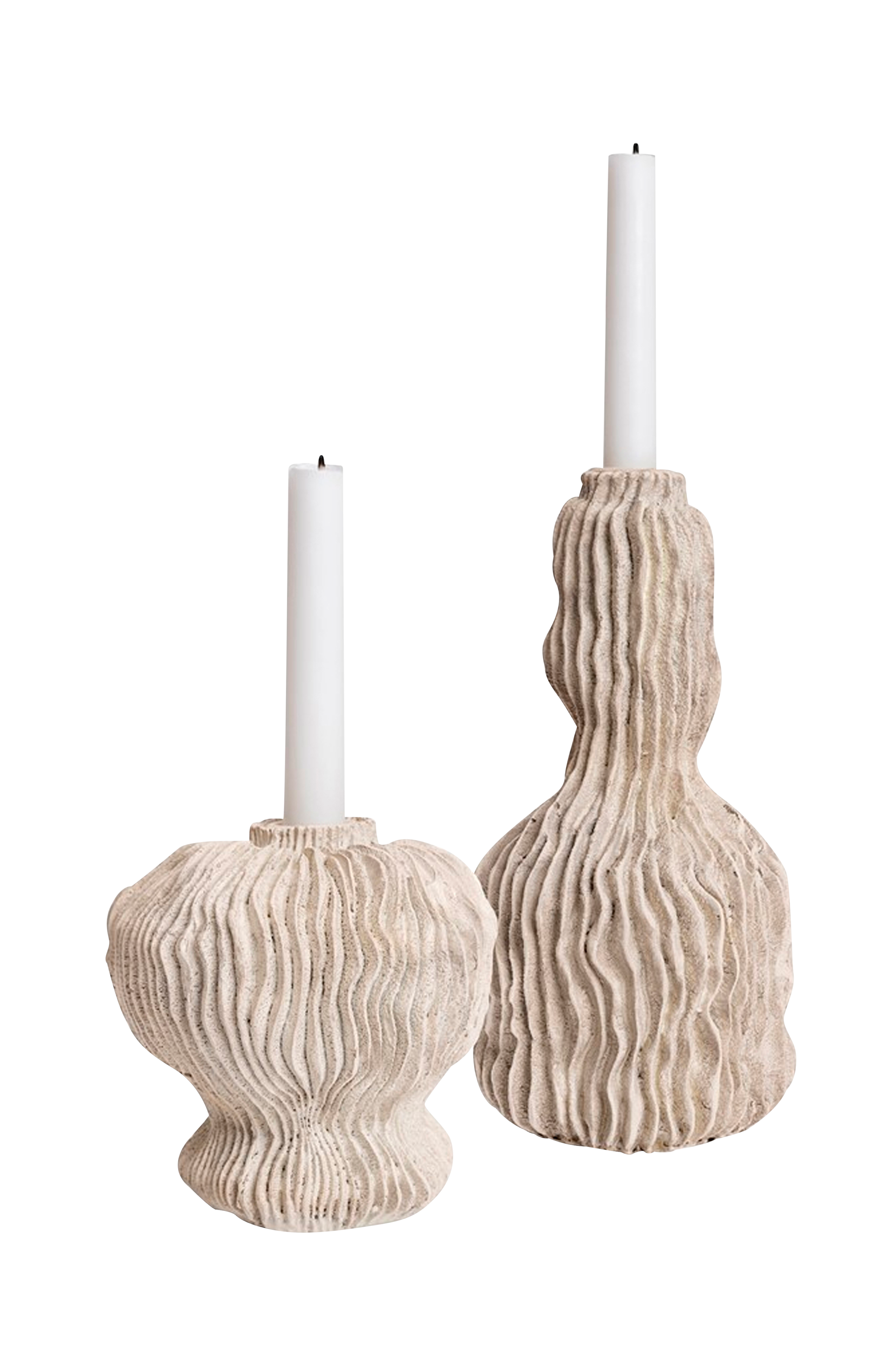 Sjarmerende sett med lysestaker i polyresin med bølgete tekstur. Lav lysestake høyde 12 cm, høy lysestake høyde 24 cm.