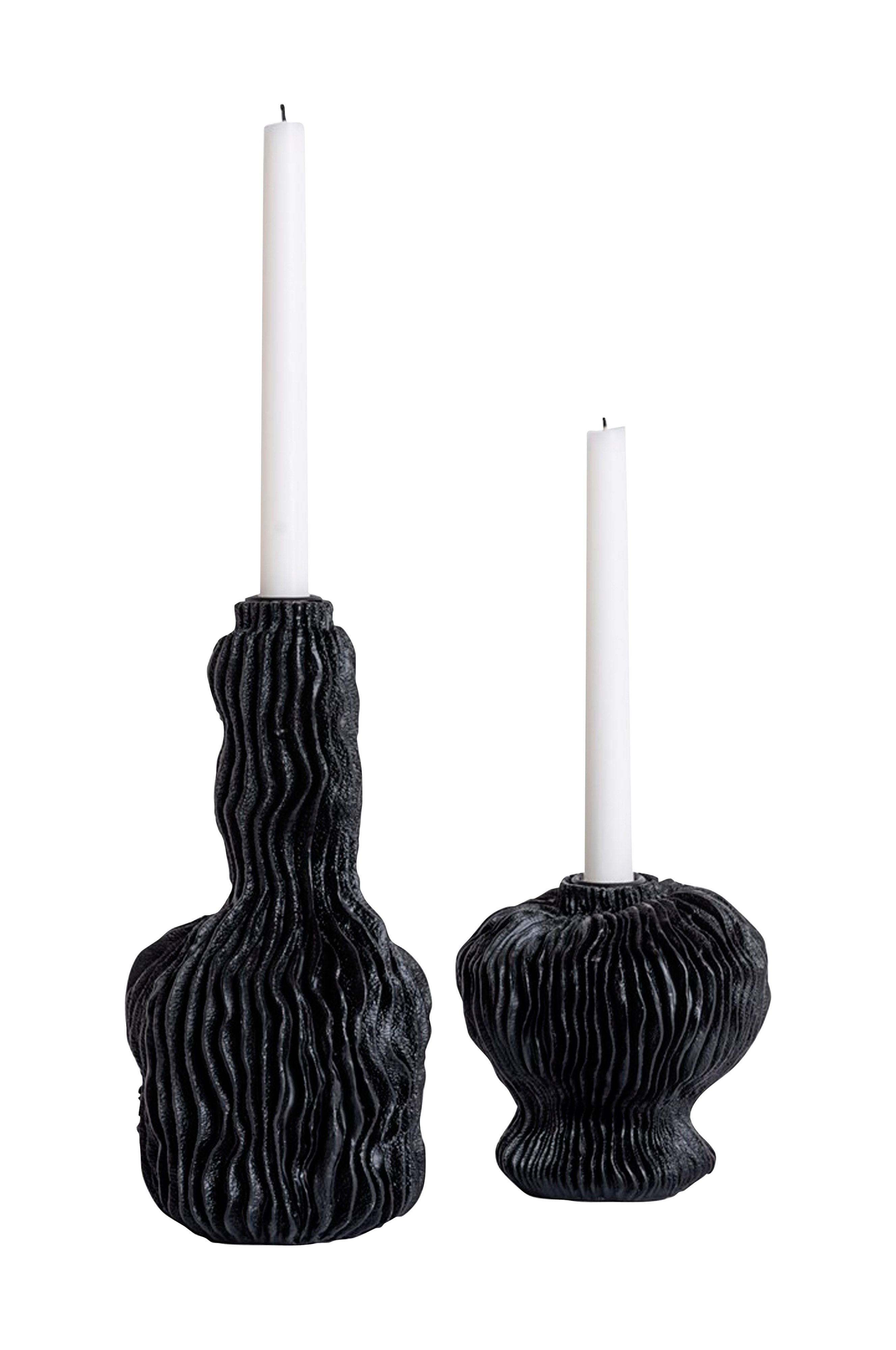 Sjarmerende sett med lysestaker i polyresin med bølgete tekstur. Lav lysestake høyde 12 cm, høy lysestake høyde 24 cm.