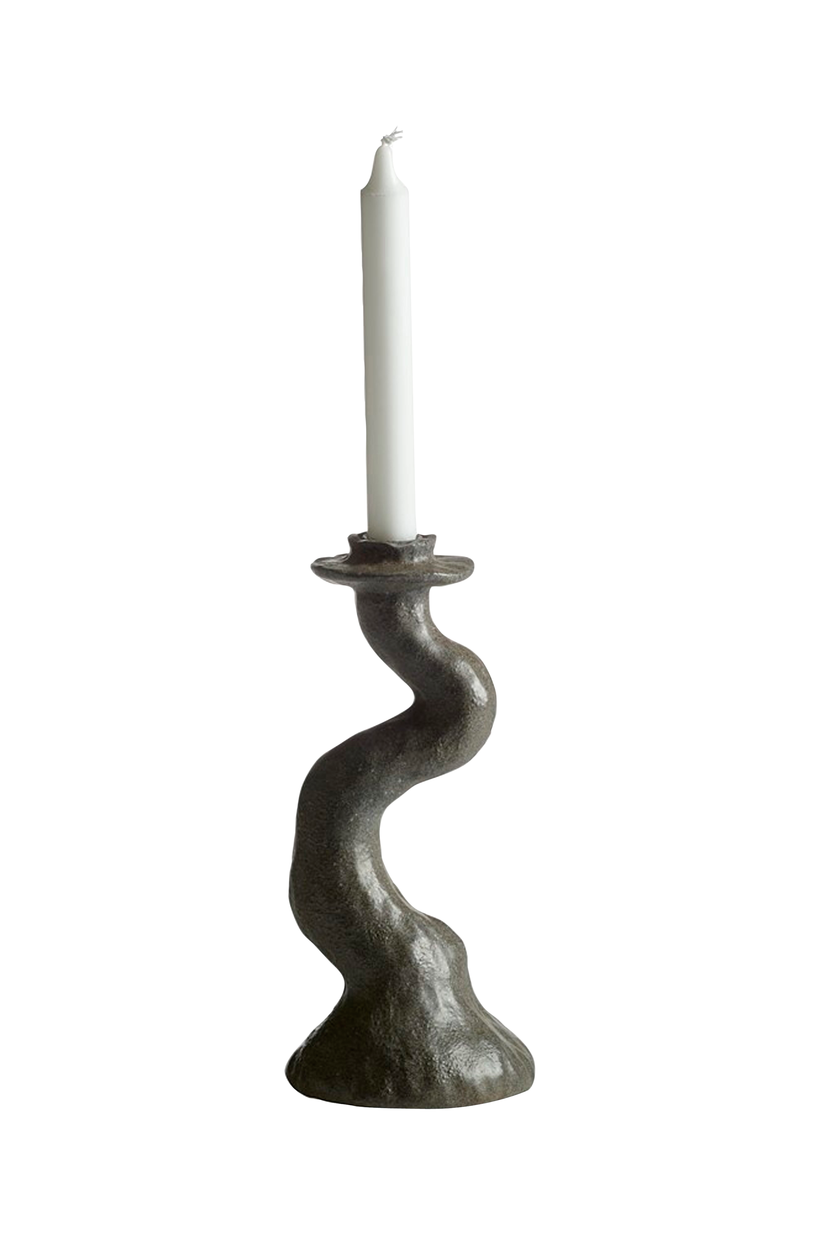 Stilig lysestake formet som et tre i en varm grå farge. Høyde 25 cm. Bredde 12 cm. 100% polyresin.