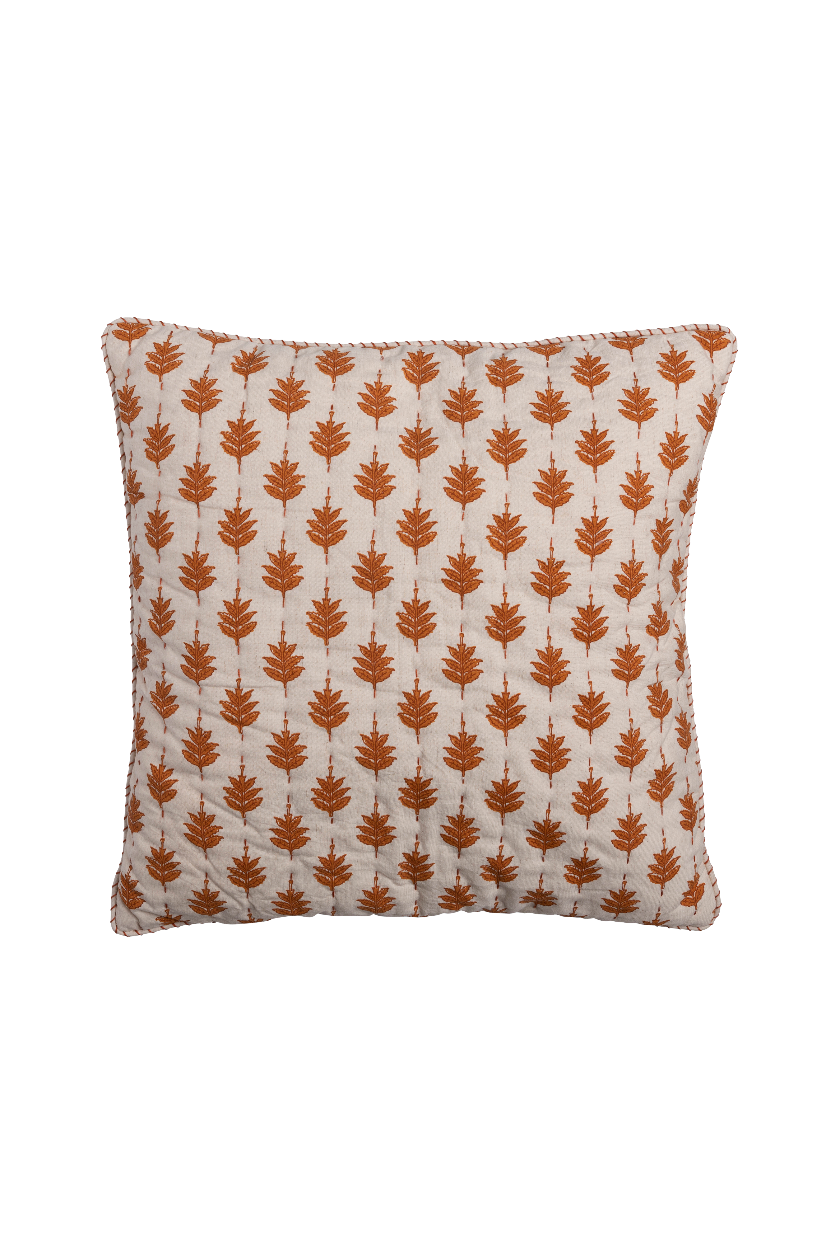 Herlig printet putetrekk i bomull/lin-kvalitet med dekorativ søm i bomullsgarn og ensfarget bakside. Biser rundt og skjult glidelås i nederkanten. Str 50 x 50 cm. Renses.