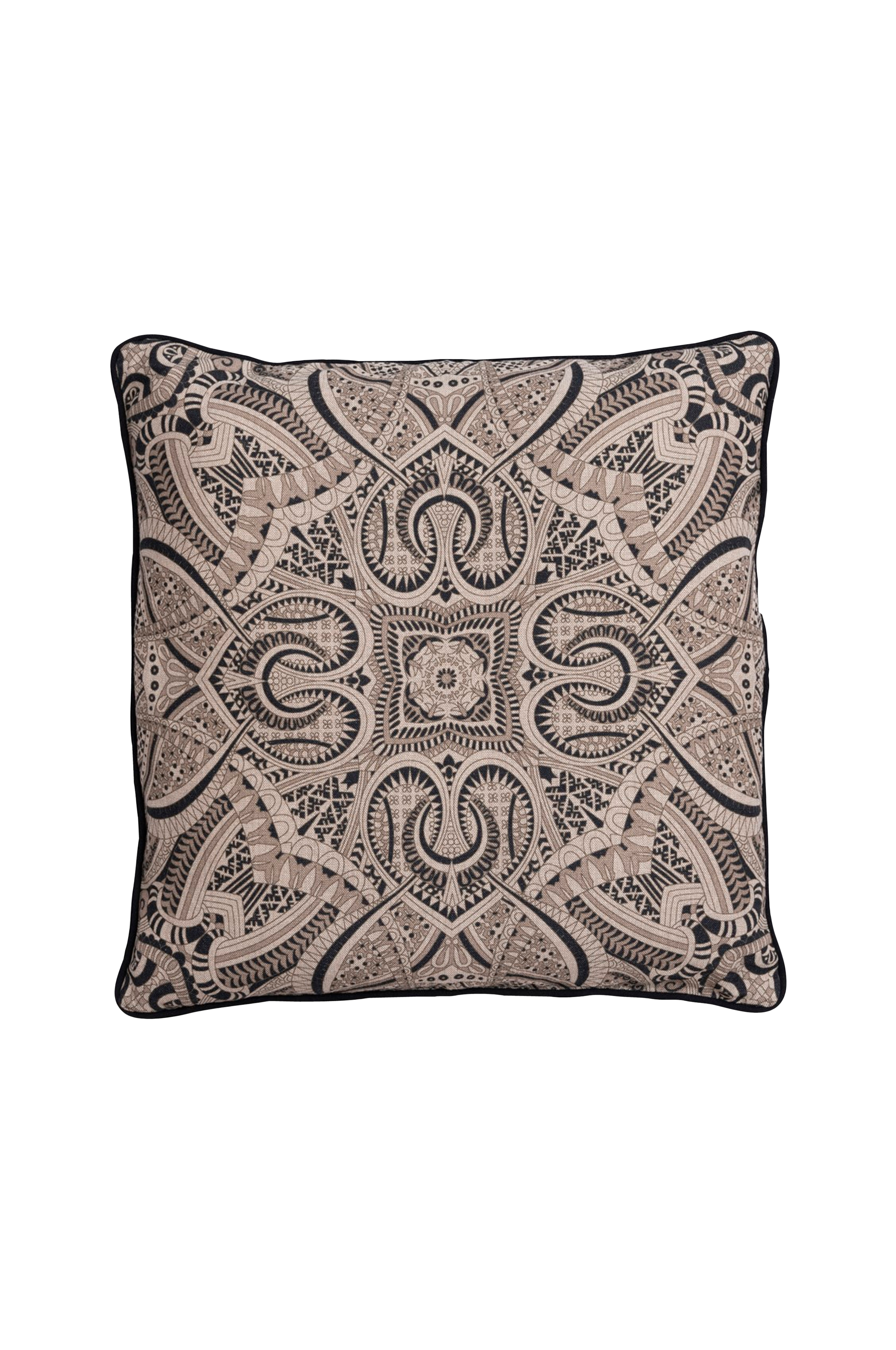 Putetrekk i 100% bomull med mønster på forsiden. Bakside i ensfarget beige og mørk blå biser rundt. Glidelås på baksiden. Str 50 x 50 cm. Vask 40°.