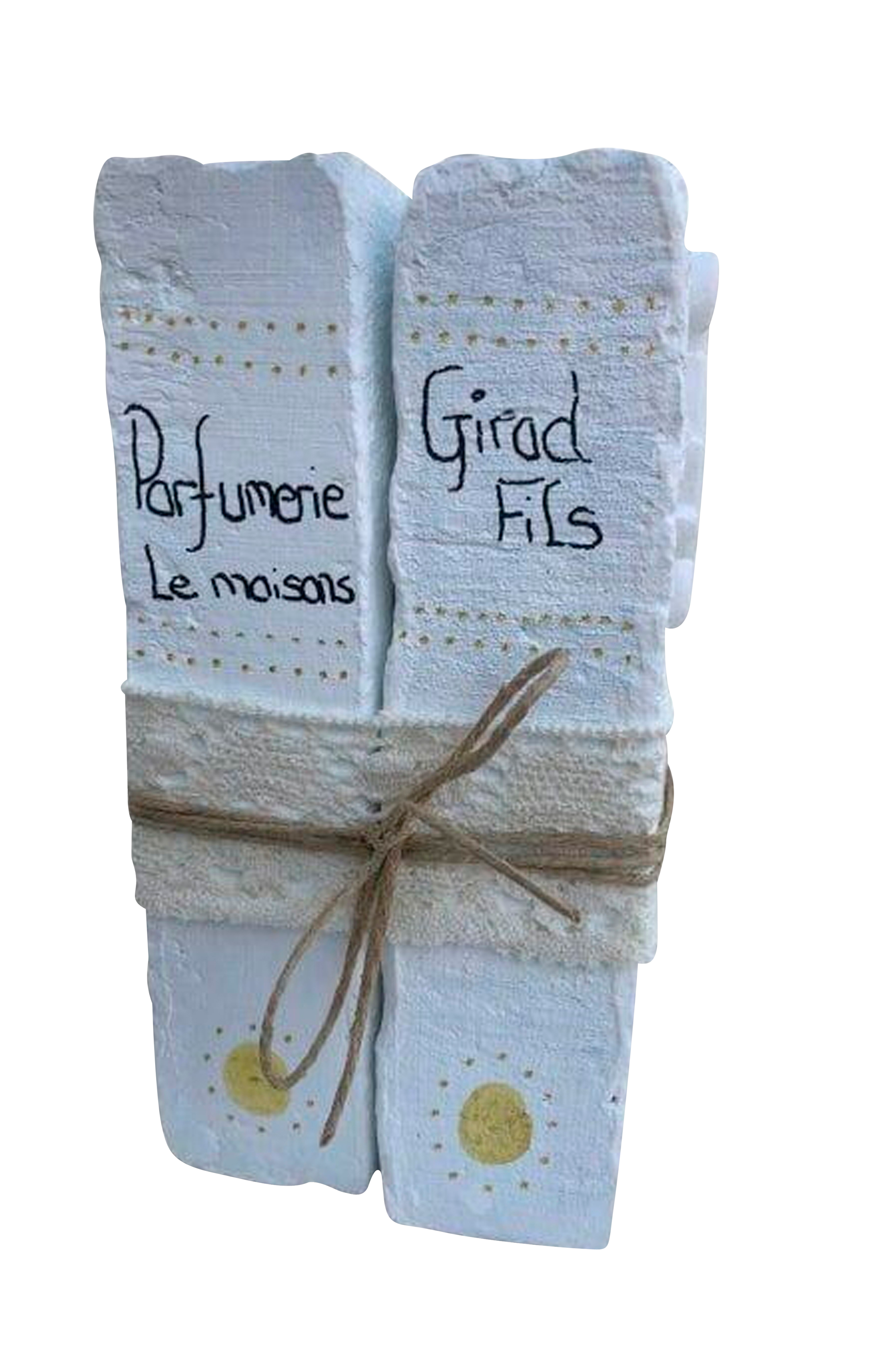 De fine dekorative bøkene er produsert av murstein, her i hvitt med teksten Parfumerie.