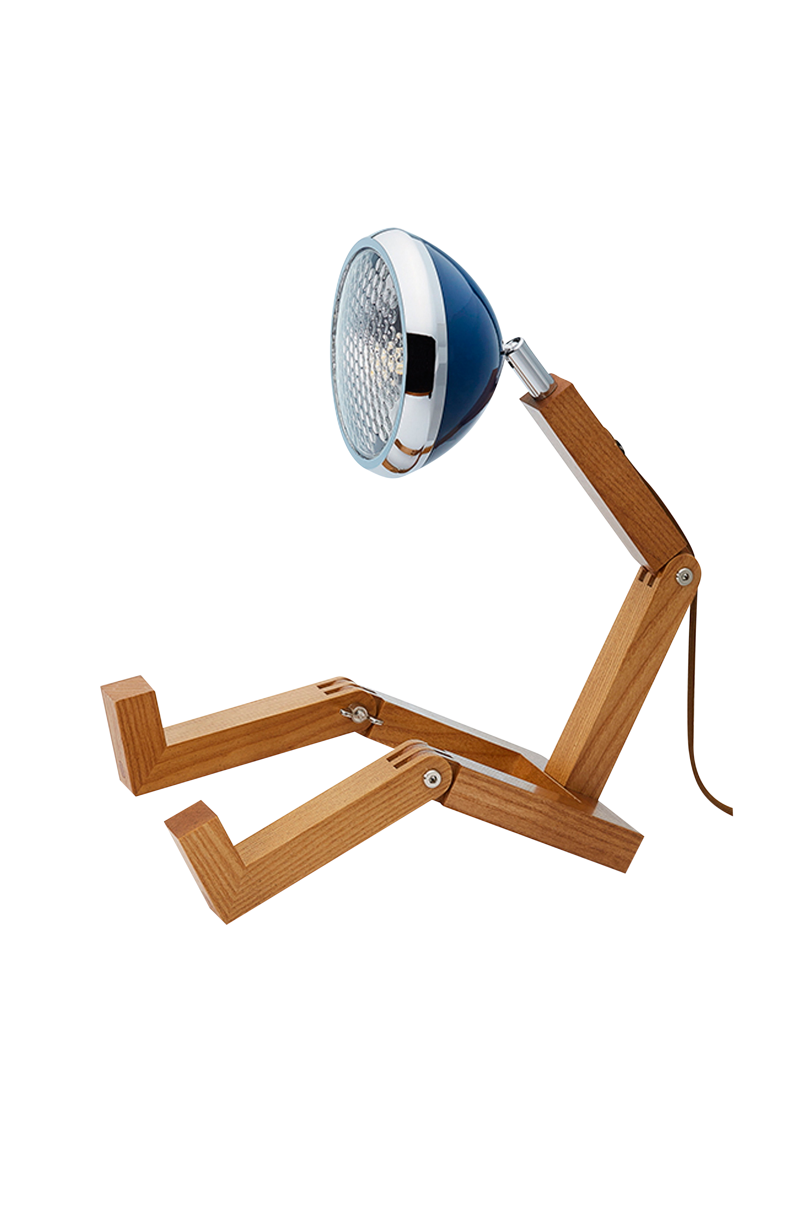Bordlampe med design inspirert av den ikoniske Vespaen og lekefigurer fra 70-tallet. Lampen er håndlaget i vakker ask. Den kraftfulle LED-glødelampen lyser godt opp, og de 139 glassboblene på lyskasteren skaper deilig stemning. Lampen kan velte hvis den settes i oppreist tilstand. Lampen er designet for å være i sittende posisjon. For stående posisjon kreves lampestativ fra Piffany Copenhagen. Mål: B 15,5 cm, D 27,6 cm, H 18-40 cm inkl. 2,3 m lang bomullskledd ledning (brun), samt en 12v g4 LED-pære (2,5w). Adapter for stikkontakt EU og UK følger med. Lumen 200 lm. Input voltage 100v-240v ac. Color temperature 2700 k. Color rendering(ra) >80 life expactancy 25.000 hr material: Ask/aluminium/metall