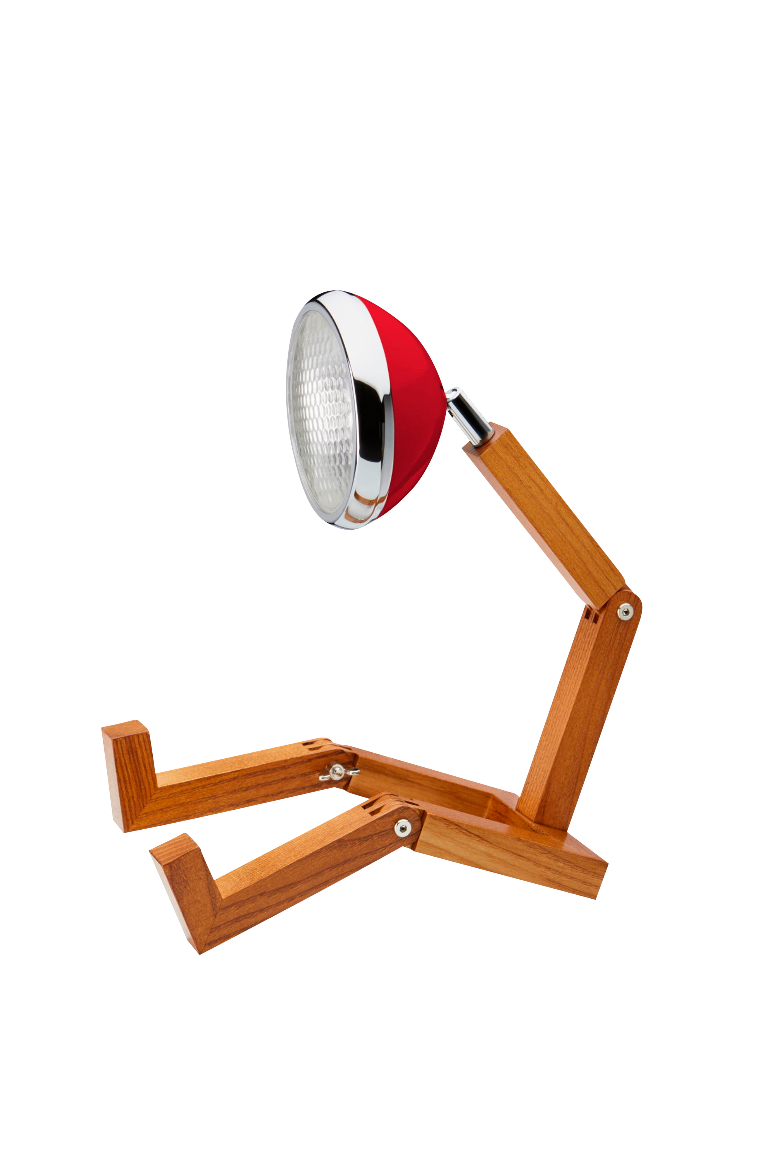 Bordlampe med design inspirert av den ikoniske Vespaen og lekefigurer fra 70-tallet. Lampen er håndlaget i vakker ask. Den kraftfulle LED-glødelampen lyser godt opp, og de 139 glassboblene på lyskasteren skaper deilig stemning. Lampen kan velte hvis den settes i oppreist tilstand. Lampen er designet for å være i sittende posisjon. For stående posisjon kreves lampestativ fra Piffany Copenhagen. Mål: B 15,5 cm, D 27,6 cm, H 18-40 cm inkl. 2,3 m lang bomullskledd ledning (brun), samt en 12v g4 LED-pære (2,5w). Adapter for stikkontakt EU og UK følger med. Lumen 200 lm. Input voltage 100v-240v ac. Color temperature 2700 k. Color rendering(ra) >80 life expactancy 25.000 hr material: Ask/aluminium/metall