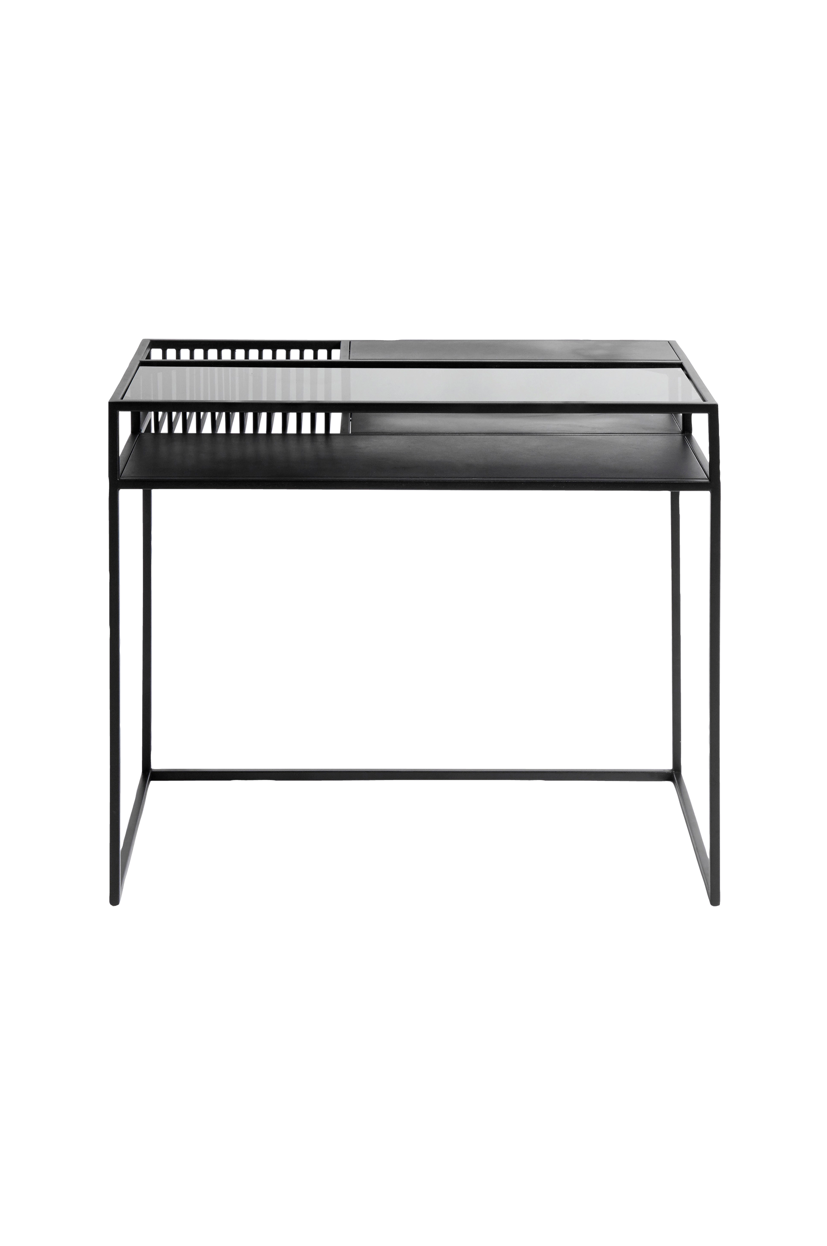 Skrivebordet fra muubs er laget av svart jern med en topplate i røkt glass, noe som gir eksklusivitet til designet.