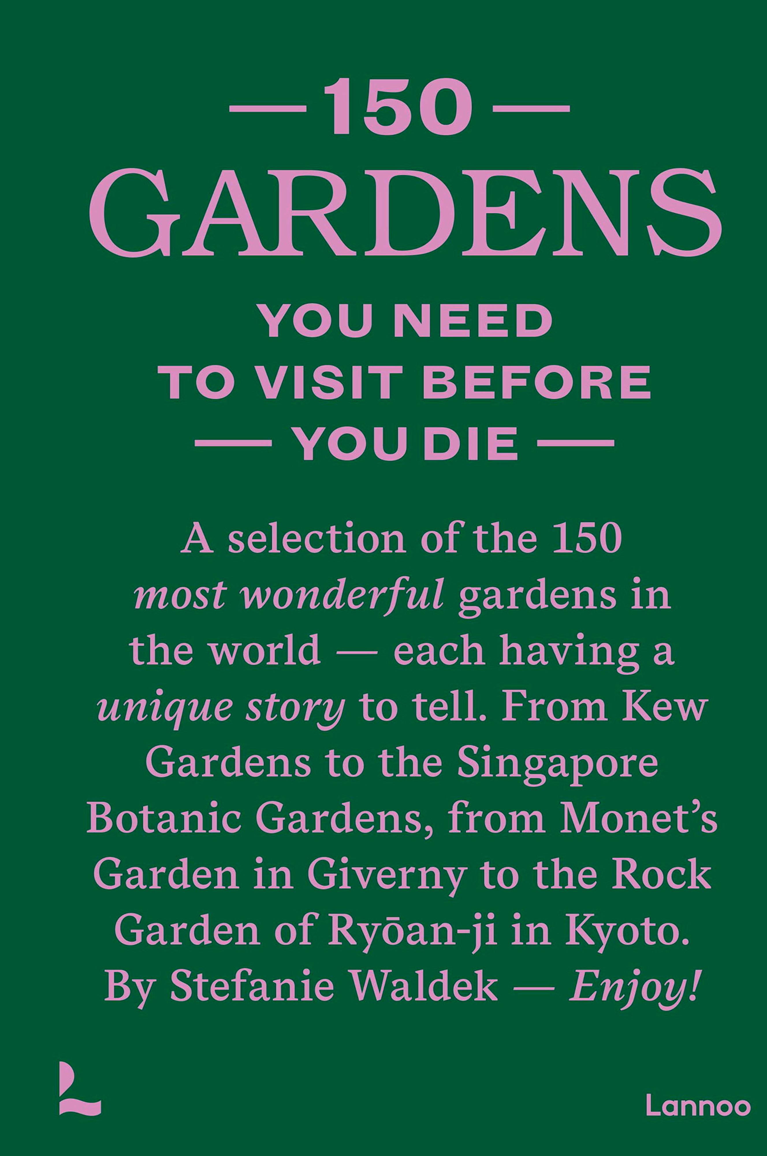 De vakreste hagene i verden i en praktisk og lekkert innbundet "bucket list"-bok 150 hager du må besøke før du dør presenterer et utvalg av de vakreste hagene i verden, kjent for sin eksepsjonelle flora, fantasifulle design og inspirerende beliggenhet. Fra Kew Gardens i London til Singapores botaniske hage, og fra Monets hage i Giverny til zen-hagen i ryoan-ji tempelet i Kyoto - denne praktfullt innbundne boken beskriver i ord og bilder de mest bemerkelsesverdige trekkene ved disse 150 praktfulle hagene du ikke må gå glipp av. En uunnværlig bok for hageelskere!