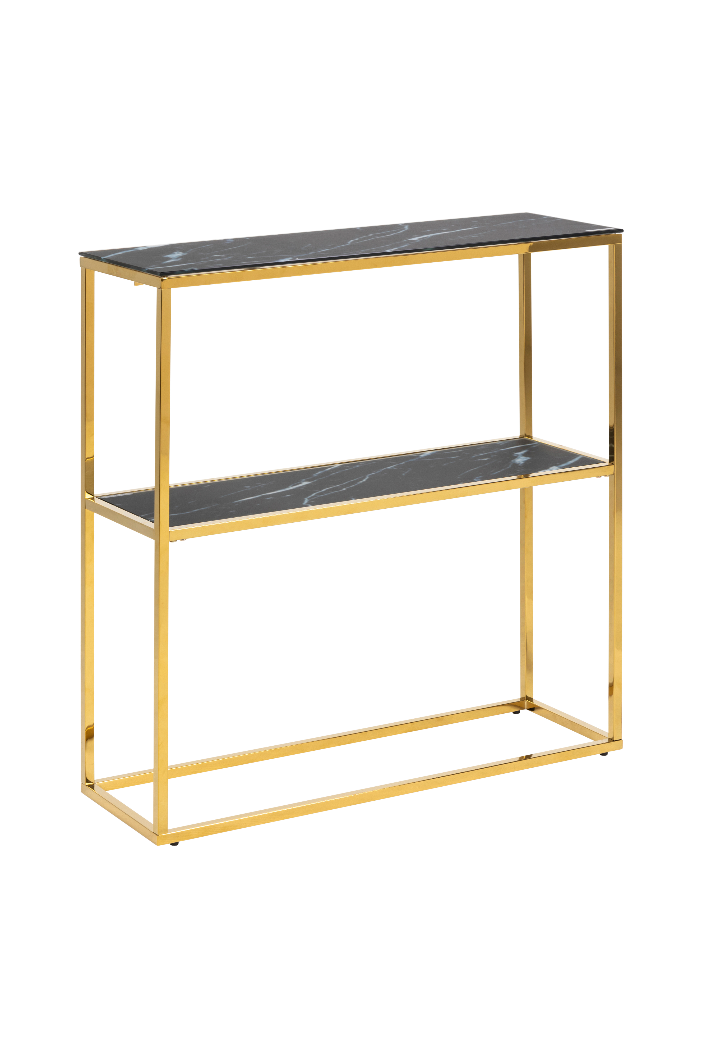 Dette glamorøse avlastningsbordet er både moderne og kraftfullt. En eksklusiv kombinasjonen av gyllent krom og frostet svart glass med marmorpreg, et avlastningsbordet som tilfører hjemmet et luksuriøst preg. Plasser avlastningsbordet i gangen eller stuen, pynt det som du vil og skap din egen spesielle stil. Leveres umontert.