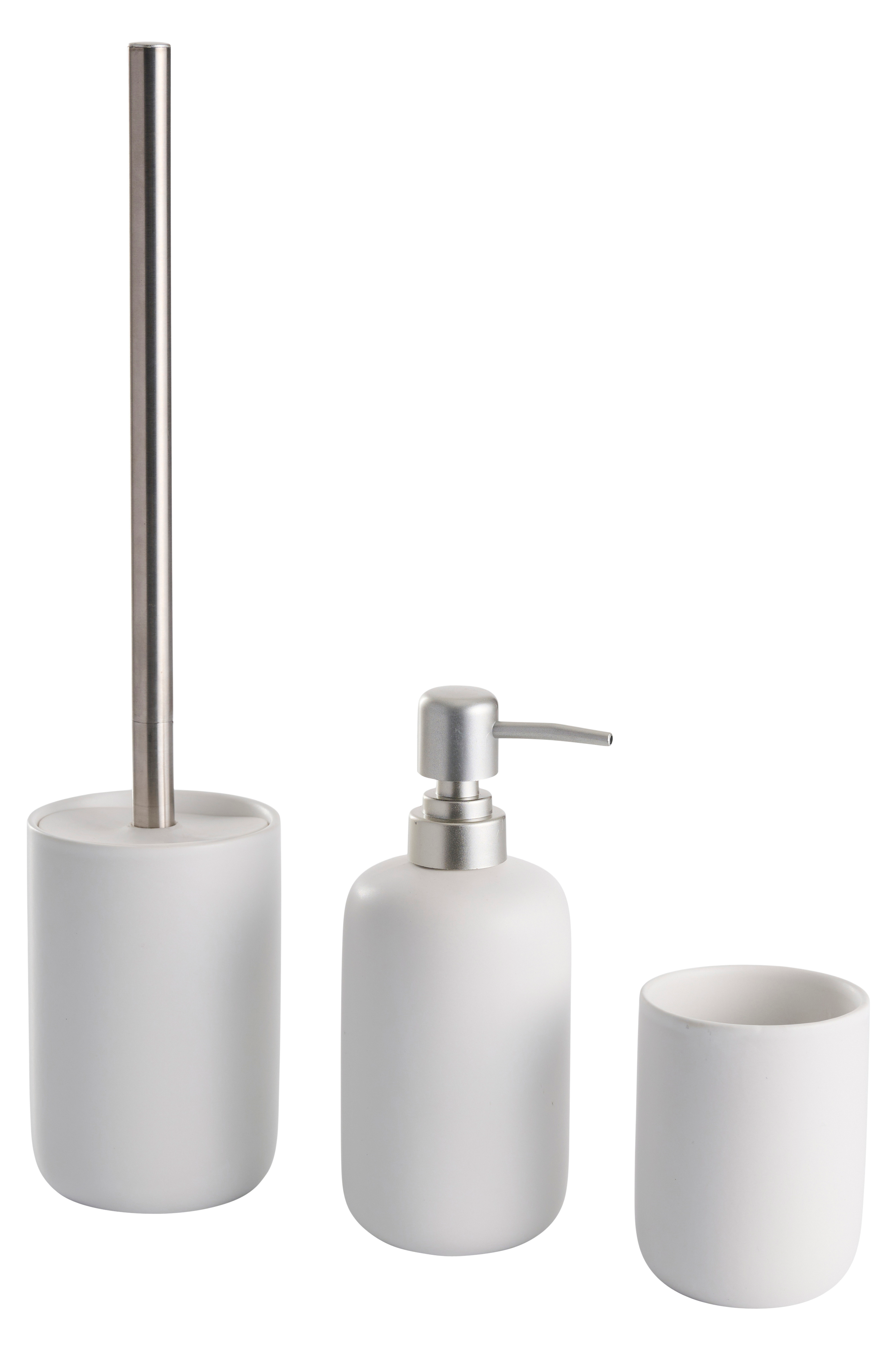 Baderomssett med såpedispenser, toalettbørste og beger. Leveres i matt svart, blank hvit eller matt grå.
